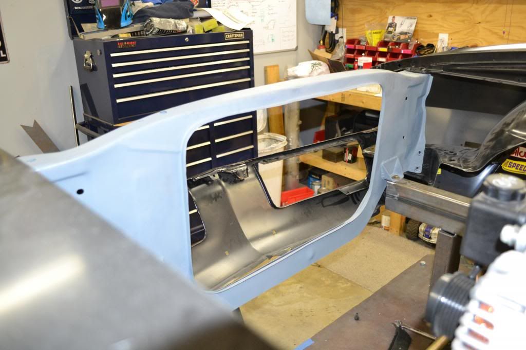 http://i238.photobucket.com/albums/f...4/DSC_1828.jpg Welded the tunnel hoops on trying to get the chassis buttoned up so I can get it off the table and start getting to the fun stuff! http://i238.photobucket.com/albums/f...4/DSC_1831.jpg Took some time to smooth out all of the holes on the radiator support that were not needed. Also opened up the radiator opening 2". For some reason GM centers the radiator on the core support but offsets the opening so I decided to go with a larger radiator. Finally got it primed and mounted back on. http://i238.photobucket.com/albums/f...4/DSC_1832.jpg http://i238.photobucket.com/albums/f...4/DSC_1833.jpg http://i238.photobucket.com/albums/f...4/DSC_1834.jpg |