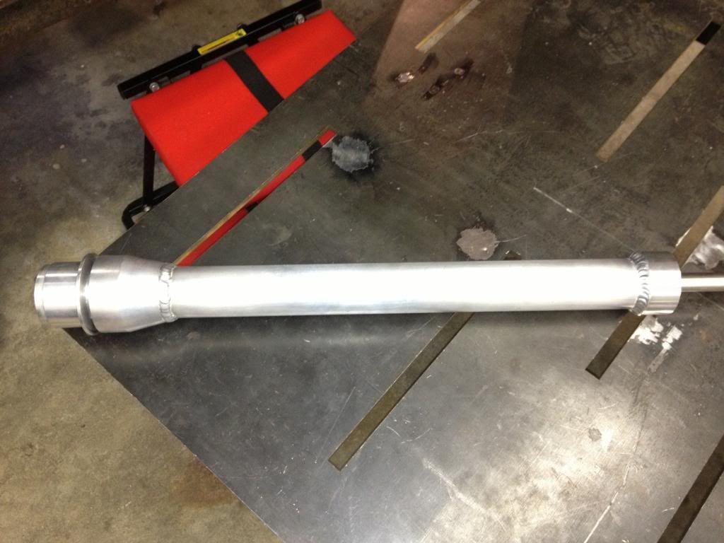 Then once I had the ends milled it was time to bolt the bellhousing ends to the jigs and put the new longer tube in. After the tube was inserted I welded the bottom the jig together with 1.5"x1.5" sqaure tubing so I could transport it and take it to the weld shop. The ends are parrallel within 1/16".