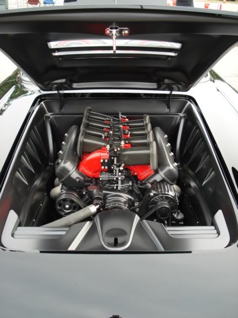 Being a roadster, the car’s interior plays a dominant roll in its overall look and feel. The custom formed seats are adorned in Italian red leather with Alcantara suede accents. The aluminum dash is hand-sculpted to perfection housing Classic Instruments carbon fiber gauges. The waterfall center console was also made by hand and the F-1 inspired foot pedals would make former Ferrari team driver Michael Schumacher feel right at home.