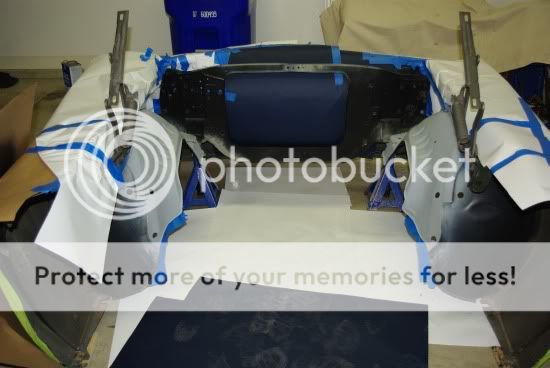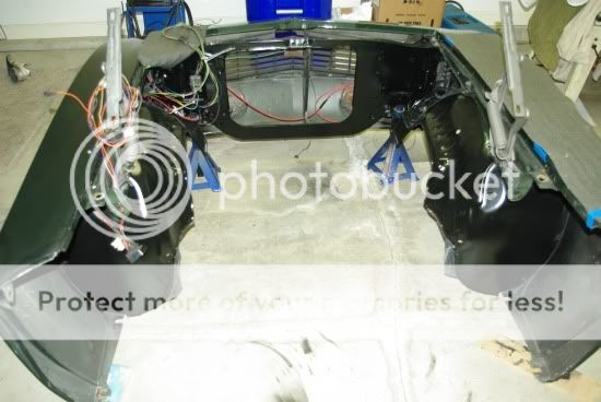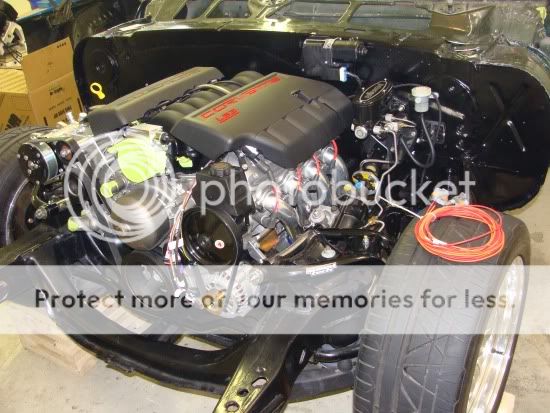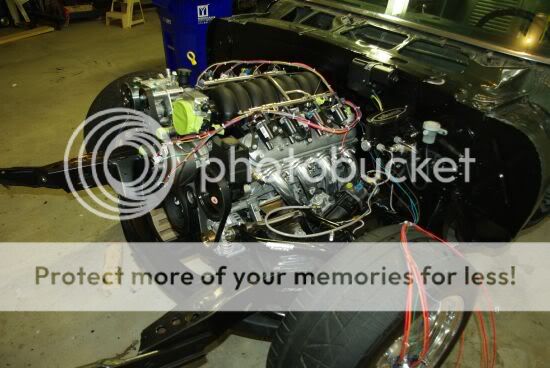Used some paper and tape to mock-up the angle for the pushrod mounting bracket while in the car, then proceeded to remove and weld while on the bench. Once assembled and back into the car, the actuation is perfect, with the pushrod remaining directly centerd to the piston during the entire stroke. http://i590.photobucket.com/albums/s...g66/LS3012.jpg http://i590.photobucket.com/albums/s...g66/LS3016.jpg Next project was to finish up the wiring connections to LS prior to reassembly of front clip. Harness is completly attached now, fuel line in place and new tank hung. http://i590.photobucket.com/albums/s...g66/LS3011.jpg http://i590.photobucket.com/albums/s...g66/LS3010.jpg The inner fenders and back side of core support needed some work, holes welded up etc. I did not wish to completely dis-assemble the clip, so I unbolted the inner fenders from the outers and pryed them down a bit to get coverage up under the outers. Worked great and I bet no-one could tell they were painted while on the car. I'm very particular, so it had to look good or I'd disassemble. http://i590.photobucket.com/albums/s...6/LS302019.jpg |