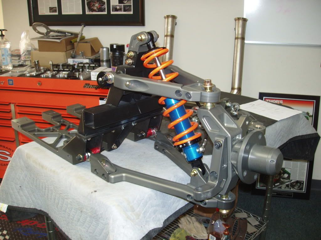 Julio from JME Enterprises stopped by the shop today & dropped off a corner of his front suspension so that we can get this fitted in the second gen frame rails we are designing.. This is a real trick looking front suspension!! Lots of billet machined pcs. :D