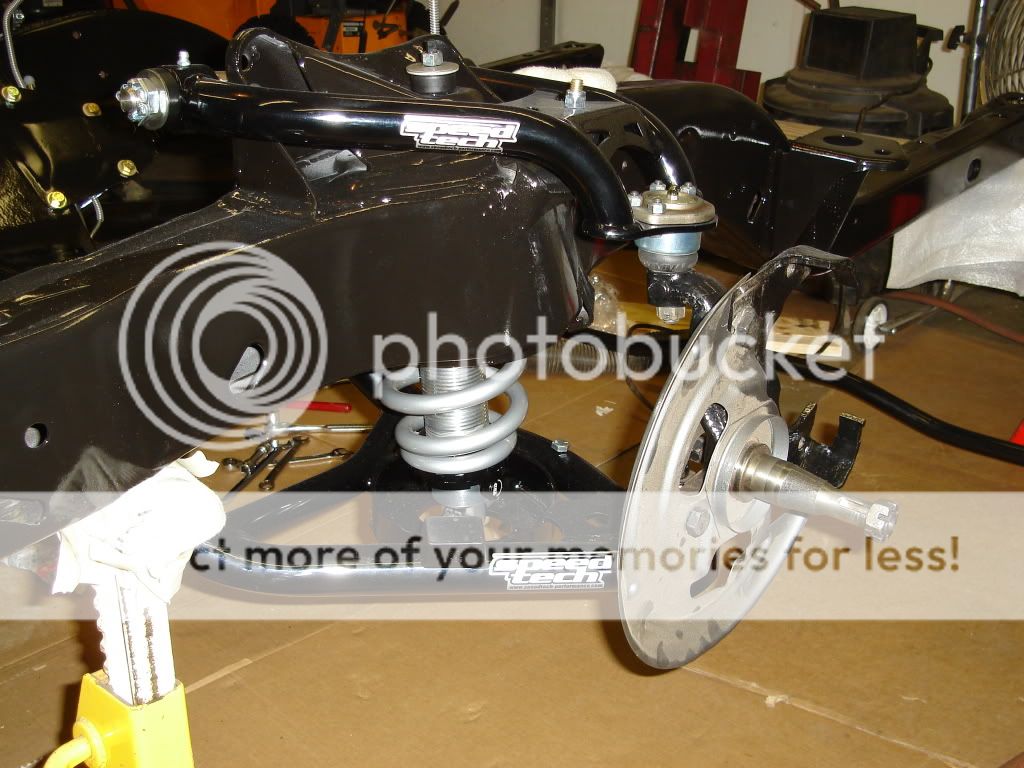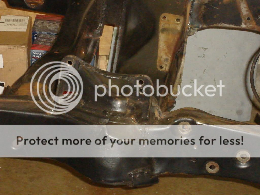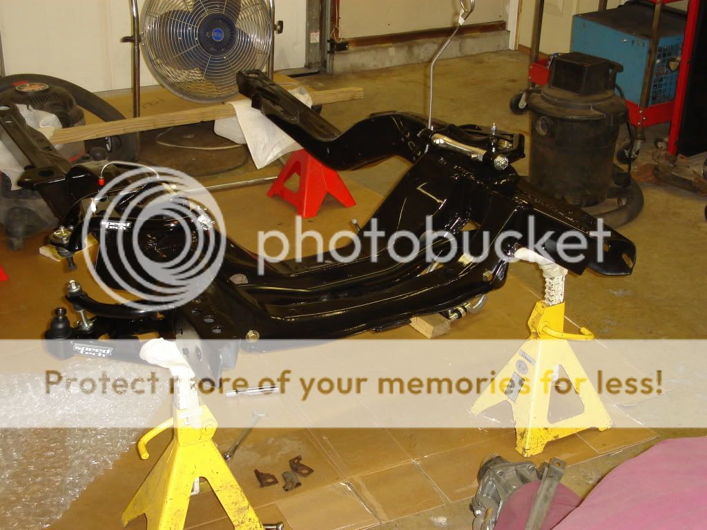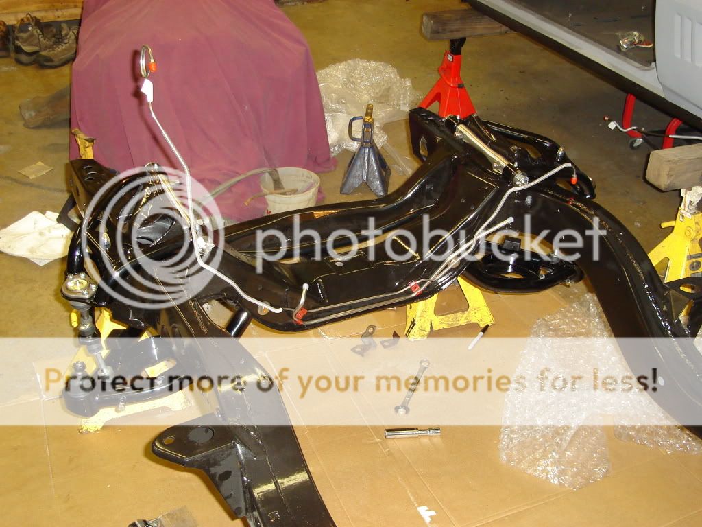 http://i319.photobucket.com/albums/m...y/DSC07000.jpg Picked up my subframe from a friends house. http://i319.photobucket.com/albums/m...y/DSC06999.jpg Started installing the control arms and sway bar. http://i319.photobucket.com/albums/m...y/DSC06997.jpg I have more to do on the lower mounting plate for the sway bar. The bar and bracket are much bigger than the stock one so I have to drill out new holes and make a threaded plate for the inside of the frame. http://i319.photobucket.com/albums/m...y/DSC06998.jpg The brake and fuel line have to go in before the engine is bolted in. They run in between the engine brackets. I still need to bolt those on. http://i319.photobucket.com/albums/m...y/DSC07001.jpg I tacked the lower perches in place on the 12 bolt rearend. If the pinion angle works out correct, I will weld it in place and clean it up for paint. |