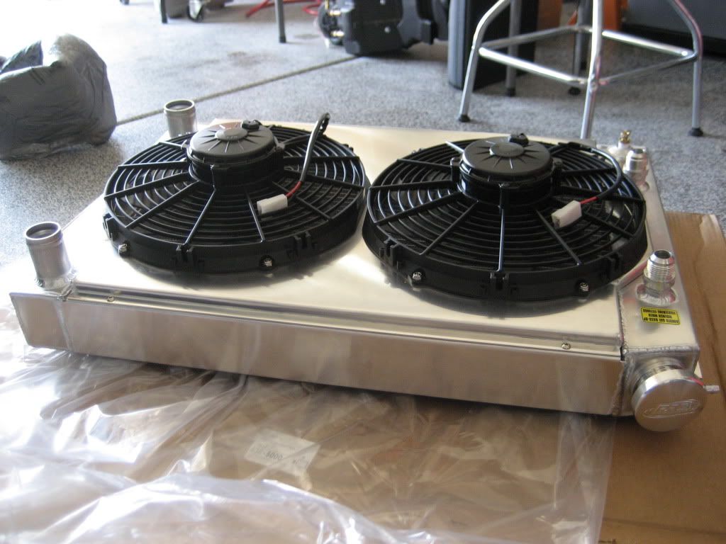 I spent a bunch of time talking to companies about radiators. Mainly Ron Davis, CSR, and Fluidyne. They all recommended the heat exchanger. Then I figured out Frank @ Prodigy Customs had the perfect package for me. I was able to get the dual pass, 12 plate/12AN heat exchanger, dual 12's, in a pretty package. Oh yeah, the price is way less than Ron Davis. I just got it today. Look awesome, I'll be sure to let you guys know how it works soon. First impression if very favorable.