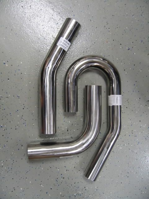 here are some of the pics of the exhaust parts. i went with the 304 stainless bends made by pypes and available from summit. 4-30* and 2-90* in 3" for the x pipe and 4 combo bends in 2.5" for the tailpipes. i would have been better off getting individual bends for the 2.5" stuff, but i thought the combo bends would provide a little more, or at least the same amount of material to work with, but i was wrong. the individual bends are 24" and the combos are 36", and the combo is the same price as 2 individual bends. go figure.