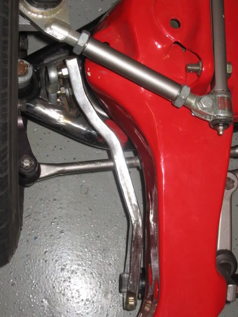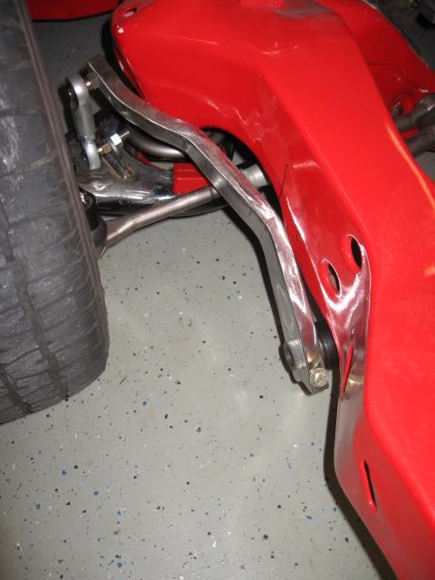 here are the final pics of the swaybar. i added one bend near the end, and i also put the studded rod ends back on. they allow for a lot more misalignment, and since theres now enough room i felt they would be the best option.