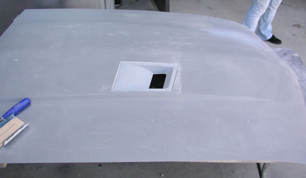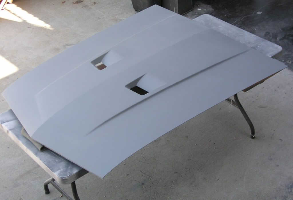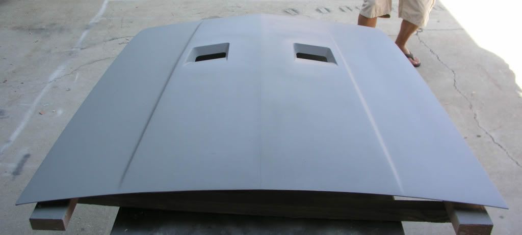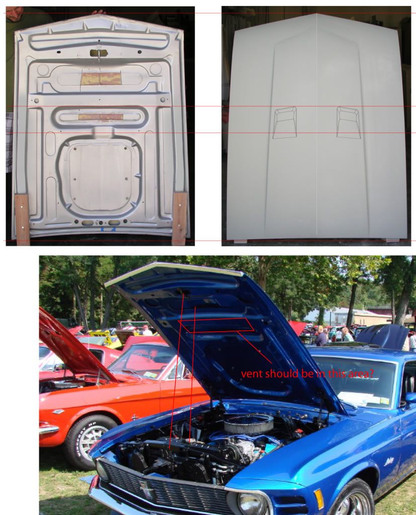 Here are some pictures of the evolution of our hood design which shows how much work that goes into making a custom part to reproduce in carbon fiber. I never liked the stock 69-70 Mustang hoods with that 'beak' or "ironing board" in the middle. I wanted to modernize it while giving it a functional aspect to boot. I really like the vents in the Aston Martin DBS hood, so we had that as our inspiration.
