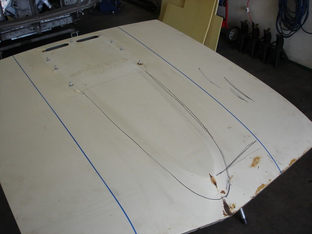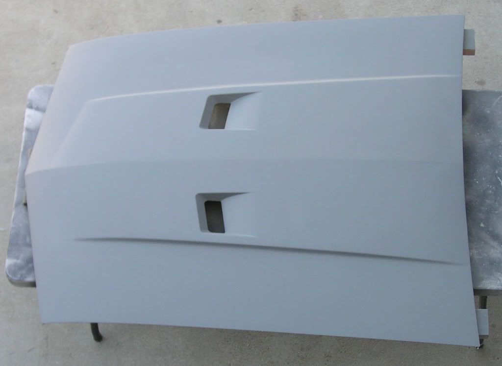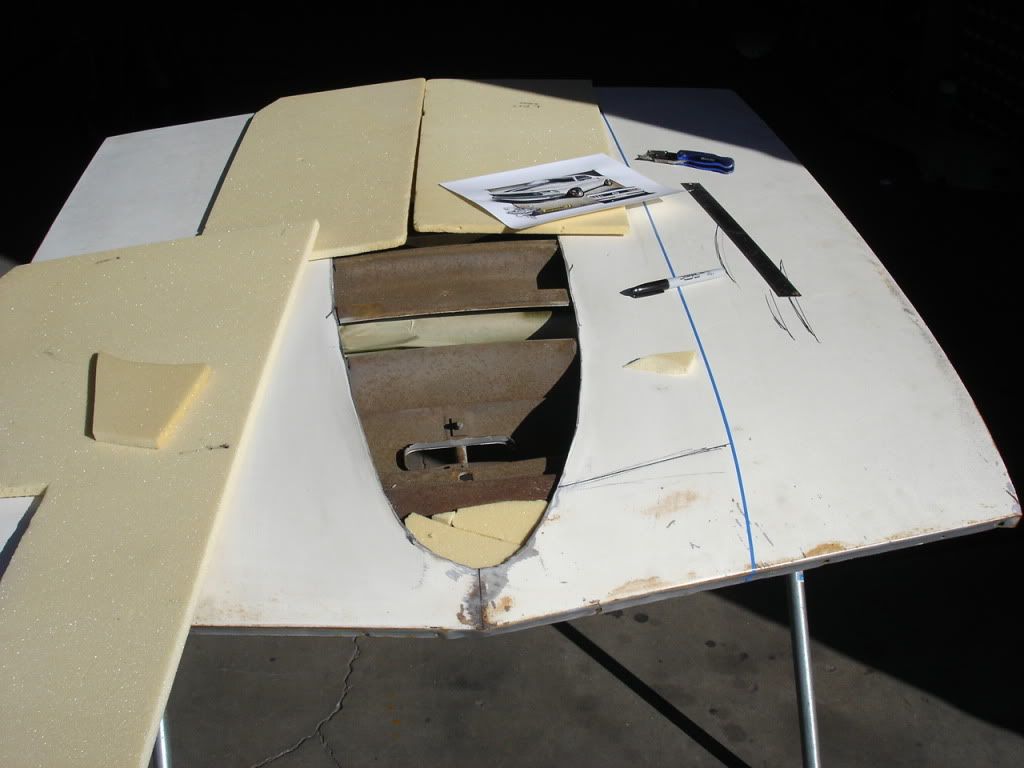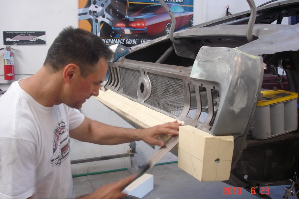 http://i219.photobucket.com/albums/c...stonHood-1.jpg http://i219.photobucket.com/albums/c...Feb5-10011.jpg Here, we performed rinoplasty on the beak and started to build up the hump in foam http://i219.photobucket.com/albums/c...Feb5-10013.jpg More foam, then bondo over the foam and lots of sanding and eyeballing with templates http://i219.photobucket.com/albums/c...Feb5-10014.jpg You can see by the illustration below that the Aston hood's vents are too rounded at that corners for the more angular Mustang, so we tweaked them to be sharper. We also realized from these illustrations that the secondary vents off to the sides and further back on the Aston hood just made the Mustang hood too busy, so we decided to axe them. http://i219.photobucket.com/albums/c...hoodtopvew.jpg Here's a screen shot of the computer model we did in Solidworks http://i219.photobucket.com/albums/c...oodventv21.jpg Next we really needed to look at exactly where it made sense to position the vents on the hood. We looked at the underside and we didn't want to have to completely redo the underside bracing, and they needed to be functional, so we reallly only had one area where they made sense. The radiator sits so far back in the car that the more forward recess on the underside is actually where the core support is. http://i219.photobucket.com/albums/c...placement3.jpg Here it is with one vent in place http://i219.photobucket.com/albums/c...Mustang/10.jpg http://i219.photobucket.com/albums/c...0Mustang/9.jpg Here's the finished hood pattern which we are making molds from http://i219.photobucket.com/albums/c...Mustang/21.jpg http://i219.photobucket.com/albums/c...Mustang/20.jpg http://i219.photobucket.com/albums/c...Mustang/18.jpg |