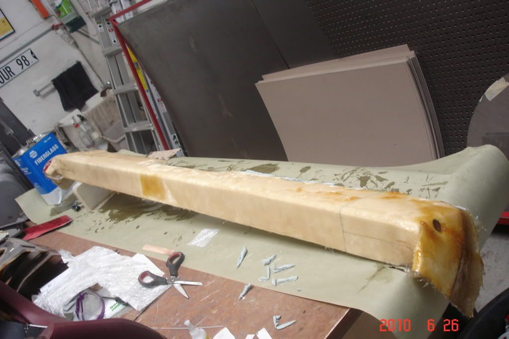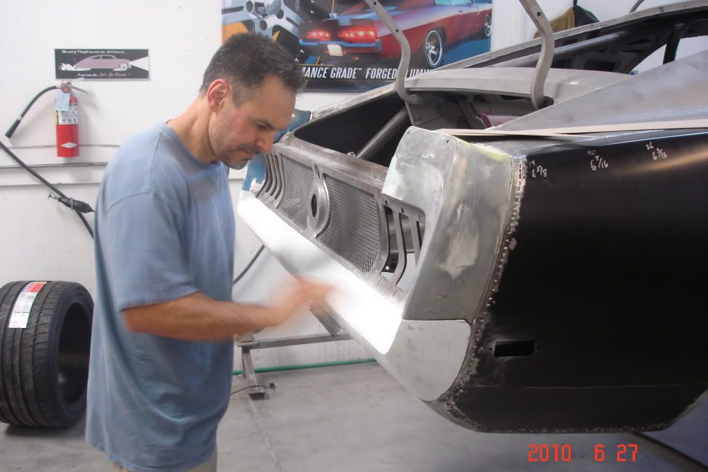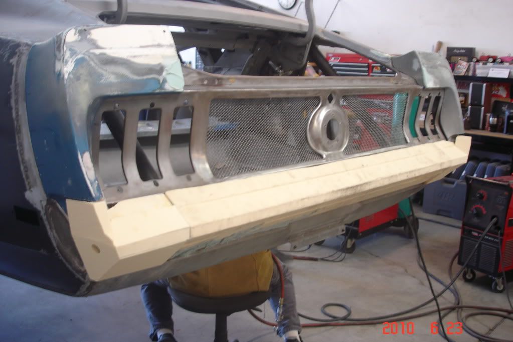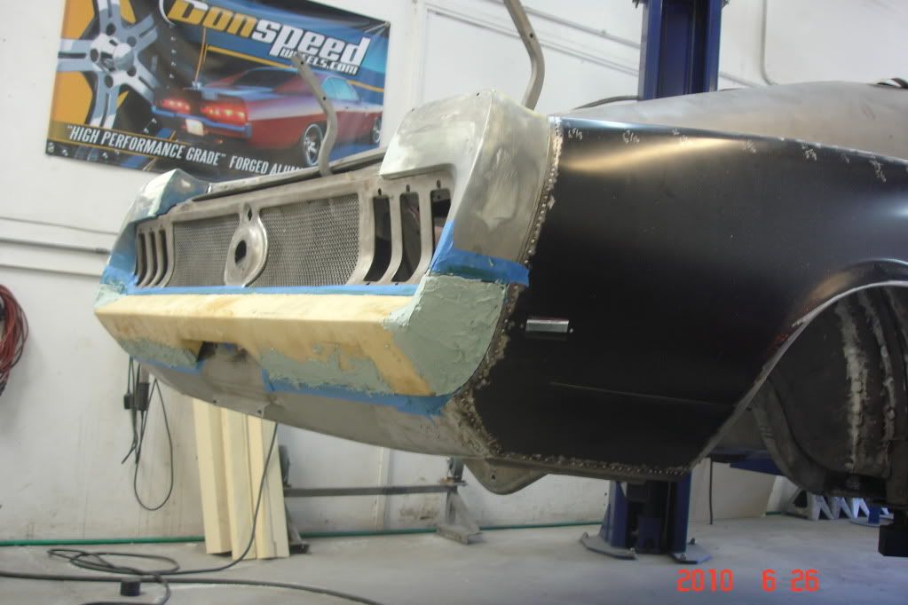 I worked on some of the parts we will be producing in carbon fiber myself including the rear bumper. Originally Steve had the steel bumper de-chromed and I was going to have his guys weld and grind on it to make the mods I wanted, but we both agreed that there had to be a better way, so I went to town on some foam and fiberglass. Mick's guys from Mick's paint did the final touches on it as well as all the other panels that are being molded to make the carbon fiber parts.