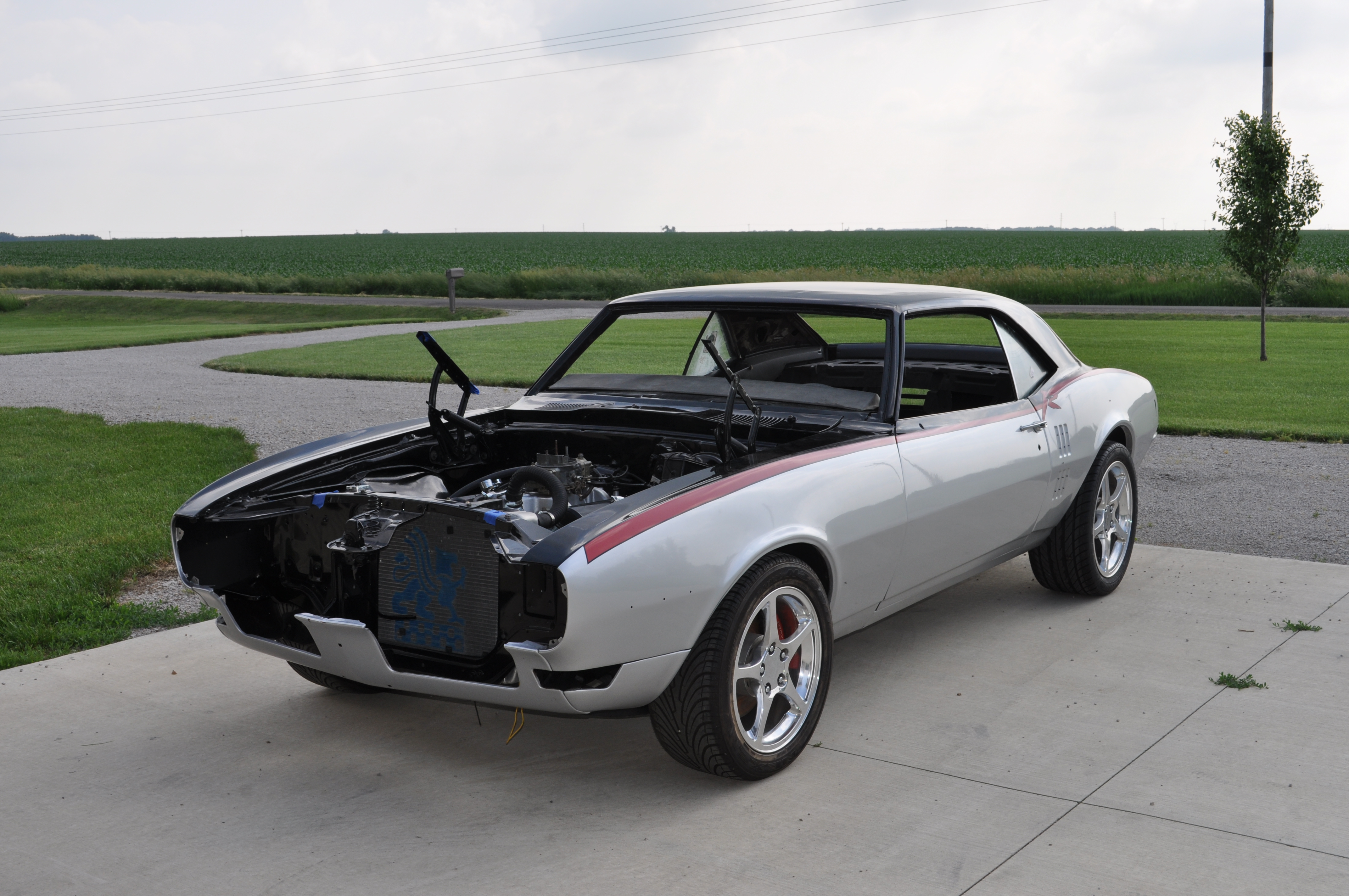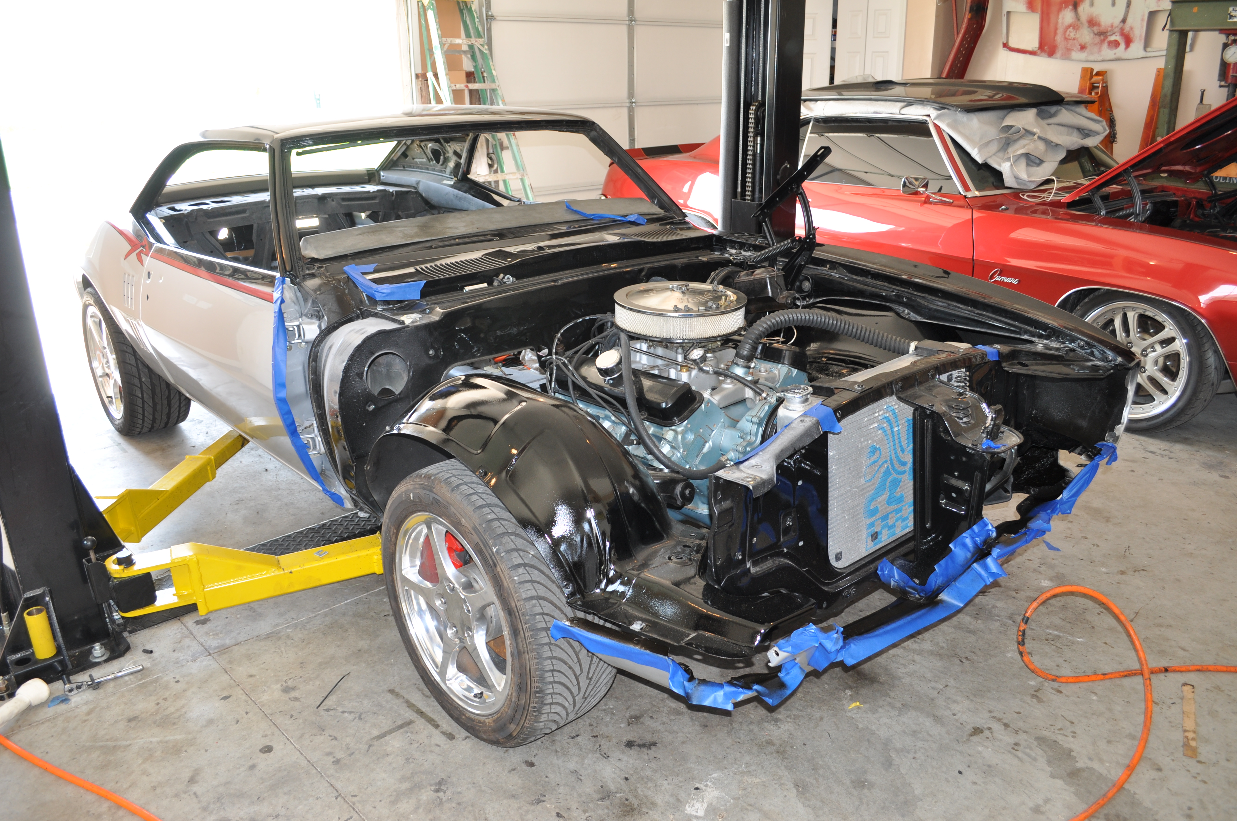 We moved the car from Florida to me here in Illinois to go ahead and wrap it up. It worked out in an amazing strange way. I was going to take a week off - go down open trailer and bring it back (2,200 mile round trip) later this month. However, a co-worker of mine bought a truck off the internet and was doing a one-way flight to Largo, Florida to pick it up. I talked him into grabbing the bird that was about an hour away in Lakeland and bringing it up for the cost of fuel and a U-haul rental. This works out way cheaper than me going to and from - AND the car arrived last week! So - this is the first time I have seen it in person since it has been painted and mostly assembled. WOW - it looks great. The guys at Maaco did a killer job. Those guys can do just as good of work as anybody when they have the time and materials to get it right. I spent the last couple of days inventorying parts, and putting everything back on that I can with what I have. We lost a header somehow in the move, but the guys in Florida are looking for it as well as some front bumper brackets that had all been blasted, primed, and ready to go on...but are awol right now. The fact it is even in the shape of a car again is a miracle considering the dozens of folks that have worked on it and the many locations it has been stored. My goal is to have it mobile in a couple of weeks and have it out and about soon after that at the local car cruise events, etc. I plan on having it done soon after and ready to roll back to Florida by November. There are some parts we still need - any part that can be donated saves us the fund raisers and other avenues to buy new - so please check your garage and see if you have: (don't have to be show quality - just in good usable condition) 1. driver door glass (non-ac car) 2. Front coil springs (I'd like to put some small block Camaro springs in to get some drop - right now I have some in it out of a 1969 Corvette that have to be blocked up under the weight of the engine as they won't hold it). 3. tail lamps 4. front marker lamps 5. front grilles 6. heater control cables 7. A nice 14" air cleaner 8. transmission cooler 9. seat belts (black if possible) 10. SEATS - would love to have some 3rd or 4th gen F body seats - the original 68 seats are just too far gone to even rebuild 11. Fuel lid that goes between the rear lamps with hinge 12. Bumpers - front/rear with brackets (don't have to be show quality) 13. inner door handles, rods, and latches (left and right) 14. Outer door handles 15. Mufflers 16. Throttle cable - not sure what to do here. The old lever system is gone, just have a new pedal on the floor and need to work it out - might just have to get a Lokar set up. Parts donated are tax deductible if desired. Will need a receipt for the value of the part supplied so the paper work can be completed and returned to the donor. I'll add/remove as we go. We need a gas tank and sending unit - but I am going to get those new and have on the way this week. I'll be putting the inner fenders in today (sprayed them base/clear PPG yesterday) and working on the wire harness through the week. I was able to get the motor/trans/drive shaft and other issues such as that nailed down yesterday. I know the motor runs the whole thing was an amazing donation from Vintage Motion out of Dawsonville, GA. Can't wait to hear it roar again. |