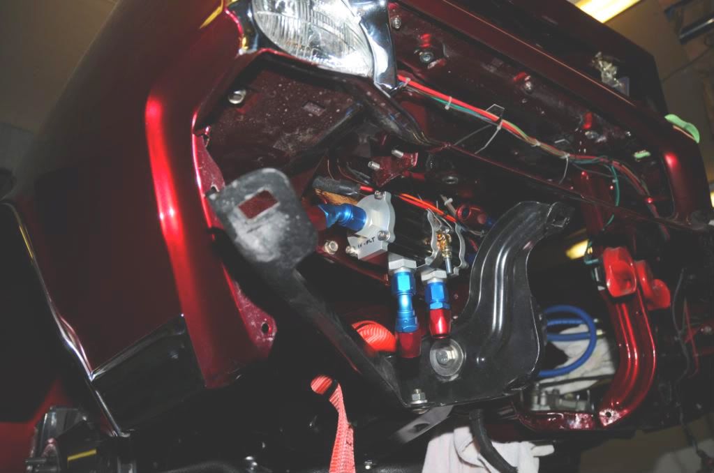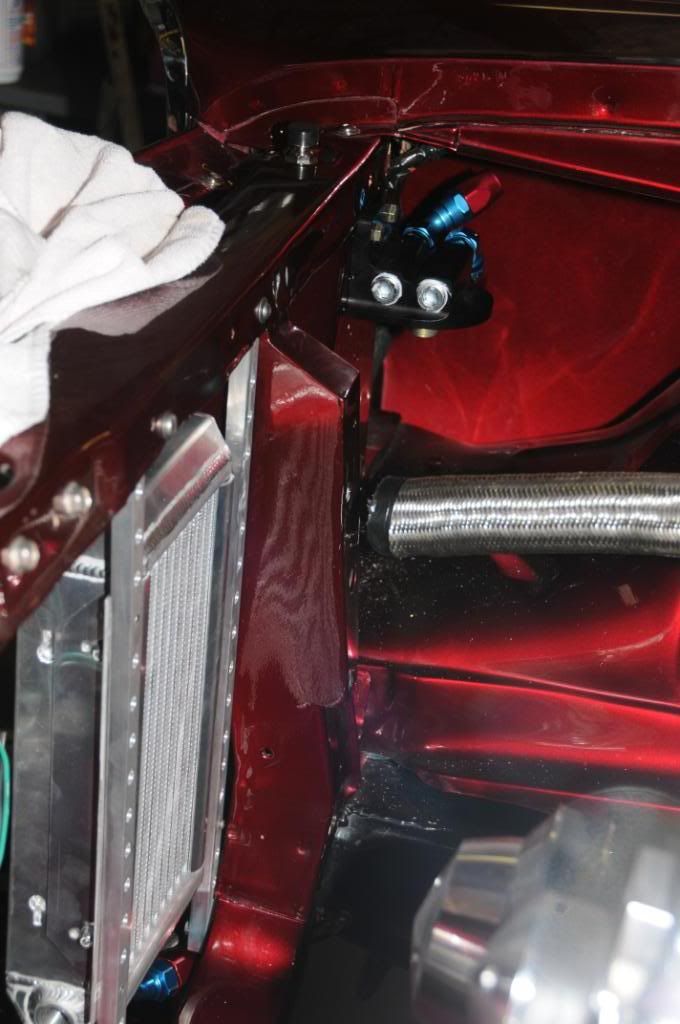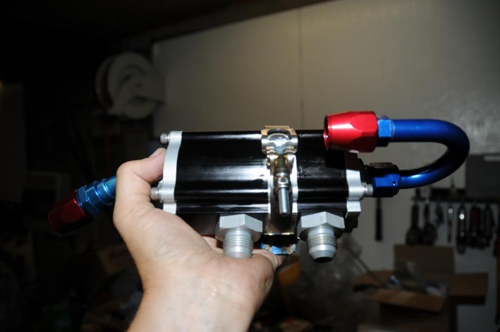 Made some progress (based on available time) on the oil lines/cooler setup. There is just so little room to work on this car. There is no room "under" the car, and no airflow that's safe other than in front of the radiator - unless I was going to fabricate a completely new core support and move stuff around in the engine bay. Here is what the front end looks like sans grill and bumper... http://i297.photobucket.com/albums/m...s/DSC_5123.jpg I decided to use the PRC cooler in front of the rad, but also add a Canton oil thermostat. Here is the thermostat with some mockup fittings? http://i297.photobucket.com/albums/m...s/DSC_5125.jpg Oil comes in one side (shown on left in pic), and until oil hits 215deg it goes straight out the right side. When it hits 215, it goes out one of the middle ports to the cooler and then back in the other middle port, and then back out. It apparently has the least resistance and highest flow of any thermostat. I was concerned about a couple things. During normal "street" driving, my water temps are 190-195, and my oil temp is 180-190. At its worst, I got my oil to almost 300 before I shut it down, and water temp was around 220. I worried that during normal street driving, the hot oil in the cooler would reduce the cooling efficiency of the radiator and increase my engine temps in traffic. I was also worried that on cool days, I'd never get my oil temps to reasonable levels and run too cool oil. The thermostat solves for both of those issues. I decided to vertically mount the cooler in front of the passenger side of the rad. http://i297.photobucket.com/albums/m...s/DSC_5134.jpg http://i297.photobucket.com/albums/m...s/DSC_5131.jpg The vertical mounting brackets are 6061 aluminum 1/2"x3/4" stock, which I drilled lightening holes in. I mounted the oil thermostat kind of behind the front bumper . http://i297.photobucket.com/albums/m...s/DSC_5130.jpg I decided to switch to a different Canton oil filter assembly, mounting it inside the engine bay kind of behind the passenger headlight. An oil line will run from the engine block plate up to between the passenger fender/inner fender, to the oil filter. It then comes out of the filter, back over toward the fender and down/around to get to the "in" port of the thermostat. The 2 cooler ports are already plumbed to the cooler. The final port will return oil back to between the fender/inner fender and then down to the engine block plate. http://i297.photobucket.com/albums/m...s/DSC_5136.jpg I installed the revised block plate with fittings last night. I only have left making 3 more lines. The engine to filter, the filter to thermostat, and the thermostat to engine. |