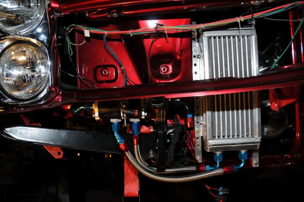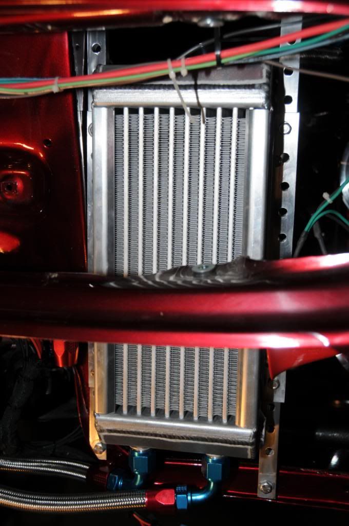I'm using a System One remote oil filter system, Setrab 14"x6" oil cooler, Mocal oil thermostat, all done in 12 AN lines. The oil filter and cooler are mounted left and right of radiator.