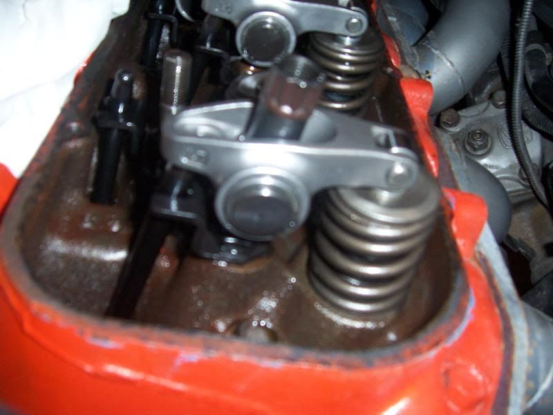 So I took the car out for a little spin today. I had installed Magnum roller rockers , guide plates and pushrods about 100 miles ago. I have a medium lift hydraulic cam in the motor....nothing too radical. I left from a light with a little of go petal and the car popped a couple of times and I backed out right away. The car immediately felt like it was down a cylinder. I pulled over and checked for anything odd. There were not any strange noises at idle and oil pressure was still good. I went straight home and could tell something was off in the motor. If I brought up the RPM's, I would get a little rattling out of the drivers side front of the motor. I let it cool down and pulled the plugs to check for anything nasty. #1 plug was black and wet, others all light tan and dry. I pulled the valve cover and found the pics below.