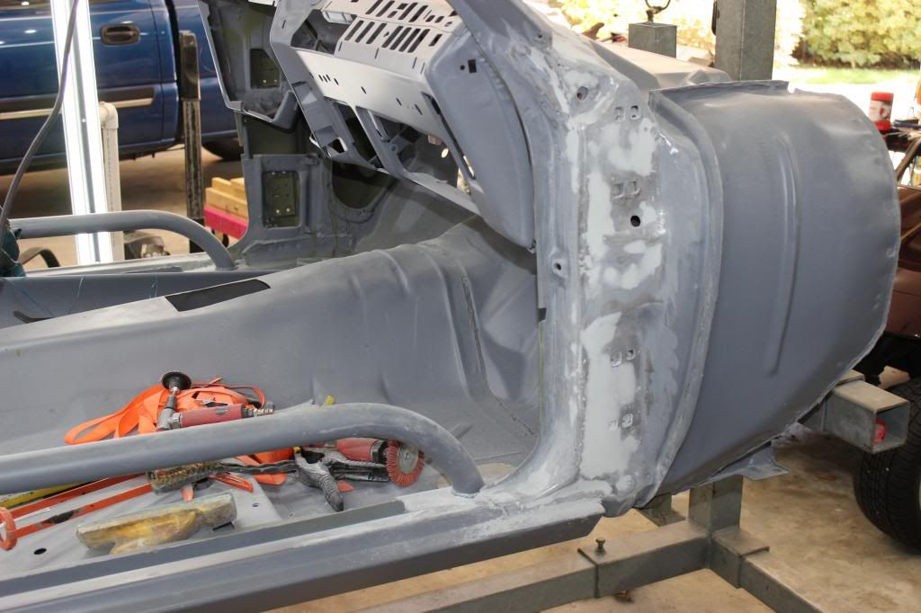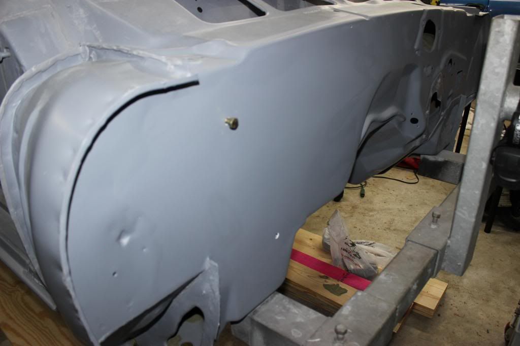 I am currently working on getting the new sheet metal lined up on the front end, hanging the fenders and and then working on the header and valance panel. :thumbsup: I got the engine fitted up with at least 3/4" clearance around the LS1 and T-56 and the tunnel. It felt strange tuning the new metal with a large hammer and blocks and then coming back and cutting out for the shifter... As I've told many people, it's just a really big 3D jigsaw puzzle...:woot: