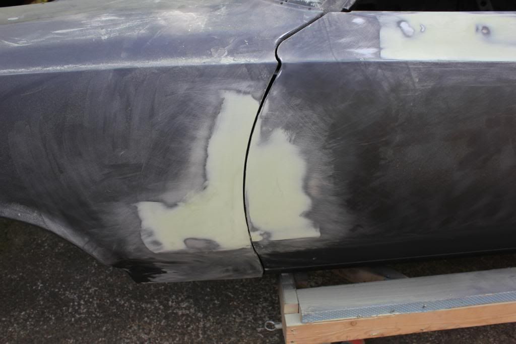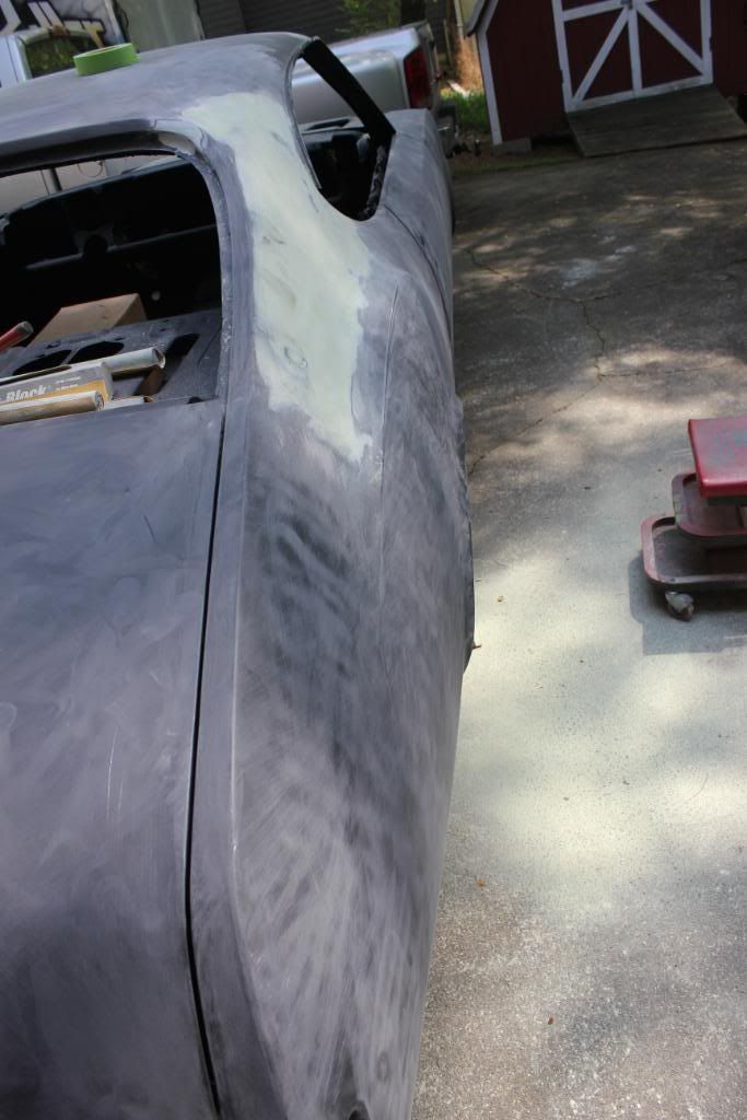 I thought I had a few pics of the car in bare epoxy, but I don't. Here are a few shots taken today, after the bodywork has been started.
