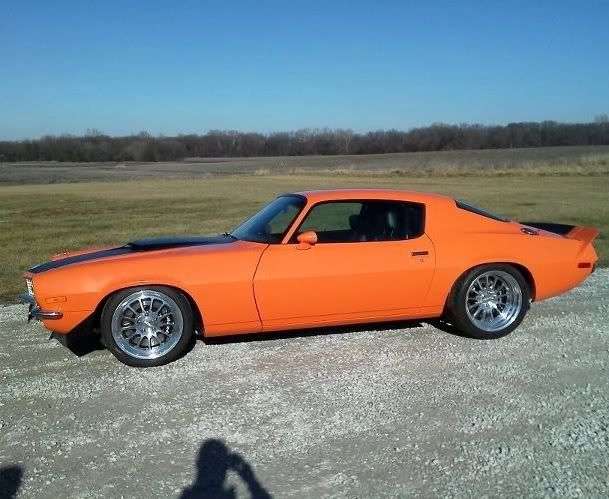 I would like to sell my latest Camaro project.It started out as a almost rust free shell.It has 1 of my sub frame's.That uses GM C-6 corvette componets.Ride SA coil over's,splined sway bar.DSE rack & pinion,Wilwood W6A brakes(frt.) W4A brakes(rear).2006 GTO LS2&T56,Speartech wiring,Forgeline ZX3's 18x11's frt.18x12's rear.BFG's 295/30/18frt.335/30/18's rear,moser 9" housing,31spline axles'strange 3:73 posi,My 4-link w/Johnny joint's & poly bushed ends,ridetech SA coil over,Rick stainless EFI fuel tank,C&R alun.Rad w/ZO6 ele. fans,Vintage A/C,Scat seat's,impact harness's,DSE minitubs,wiper motor,body bushings,rol cage,Custom Lower Dash panel,RingBros hinge's,All glass is brand new.The Orange paint is the same color as DSE built DaleJr.72 Camaro.At the 2011 RTTh's W/Kevin driving the car it was 7th fastest out of 83 car's.It drive's very nice now that I upgraded to the RideTech coil over's.It has a few small paint chip's in it now we have been driving it.But I can have those fix if needed.Looking For 75K.Please PM me or Email,Or call the shop 1-785-594-7481,or eves.1-785-594-3299.Thank's Scott Mock. https://lateral-g.net/forums/showthread.php4?t=28883