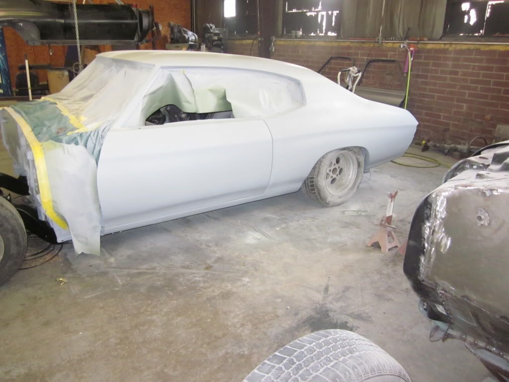 This project was brought to me in the last week of April 2011.On the phone the guy tells me he purchased a 72 chevelle at the Charlotte auto fair.He ask how much it would it cost to get to racing stripes painted on the hood,roof, and trunk of his car. I didn't give him a price because there are to many variable involved when pricing even the smallest of jobs. I told him i would have to see it in person any order to give him a price. He agreed to bring the car a week from the day we spoke. O i forgot he said the car was in decent shape it had just received a paint job from the guy he bought it from.So a week later he shows up with the car on a trailer telling me he had just pick it up from the seller. As soon as I looked at it I knew there was something going on underneath the the paint. I told him i wouldn't be able to go over what was there. The paint was bubbling up in a few spots and i noticed some wrinkling in other :_paranoid . I explained that the car needed to be stripped in order to start from a sound foundation. long story short we talk about other ideas he had for the car and i told him i could do almost all except interior. he left the car at my shop over the easter hoilday and said he would make a decision in a few days on what he wanted to do(he thought i was lying about the condition of the car).http://i1210.photobucket.com/albums/...rm1986/100.jpg