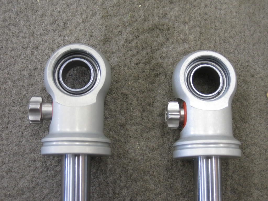 This is a pic of the upper eye of the shock where the adjusters are. You have to fully turn in the adjuster to allow the upper spring retainer to fit over it. The one on the left is fully extended while the one on the right is fully turned in.