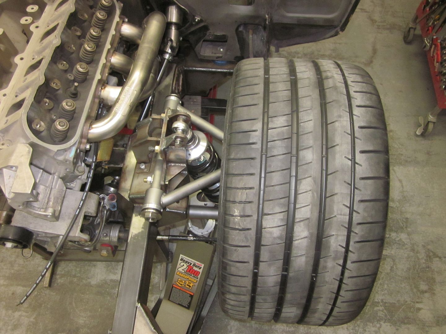 We got around to mounting some front sheetmetal to confirm that all measuremnts were good.. plus check the ride height & center wheel well opening on center of fender... The front tire is a 295-35-18 on 18x10.. Just need to modify the inner well torwards the fender mount for clearance.. We automatically built -1 camber into the lower control arm.. Currently running -3 camber & 5 deg on caster..