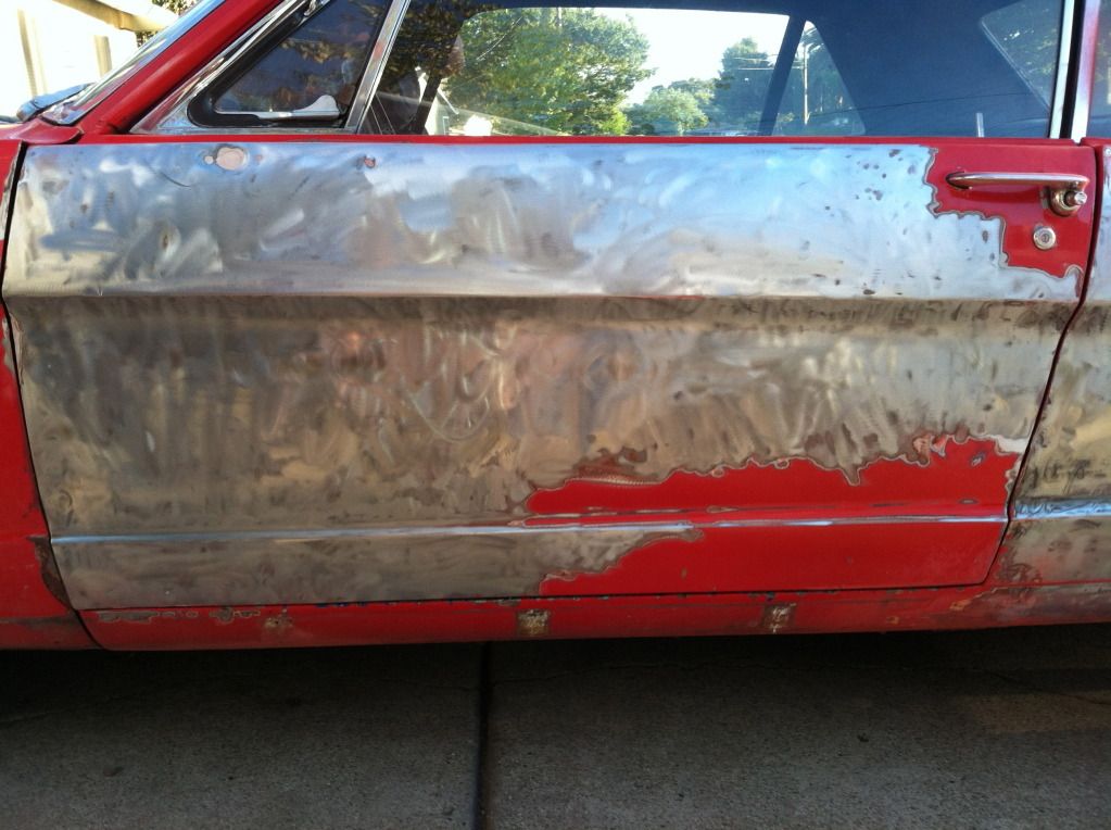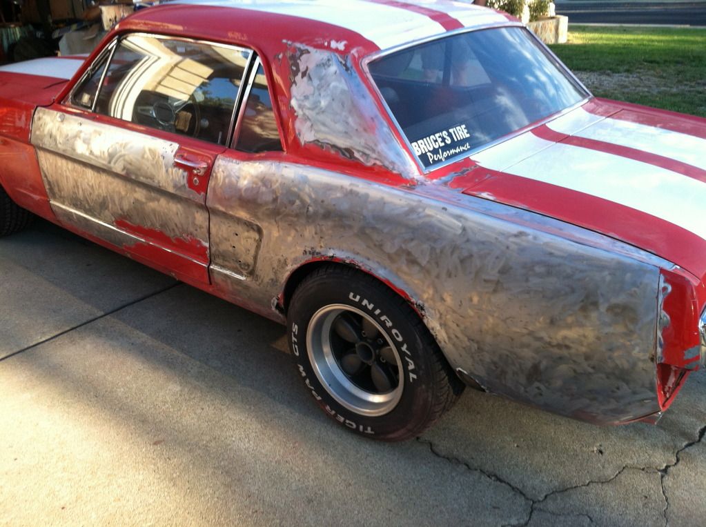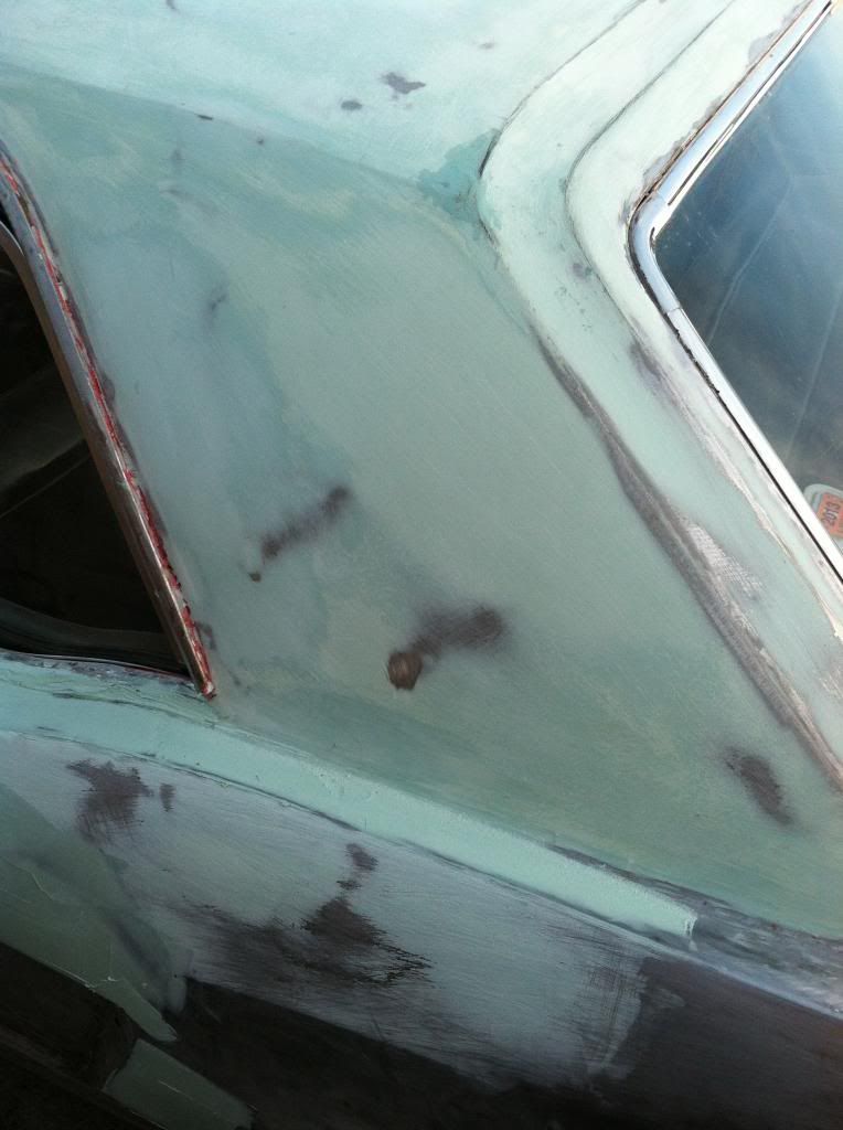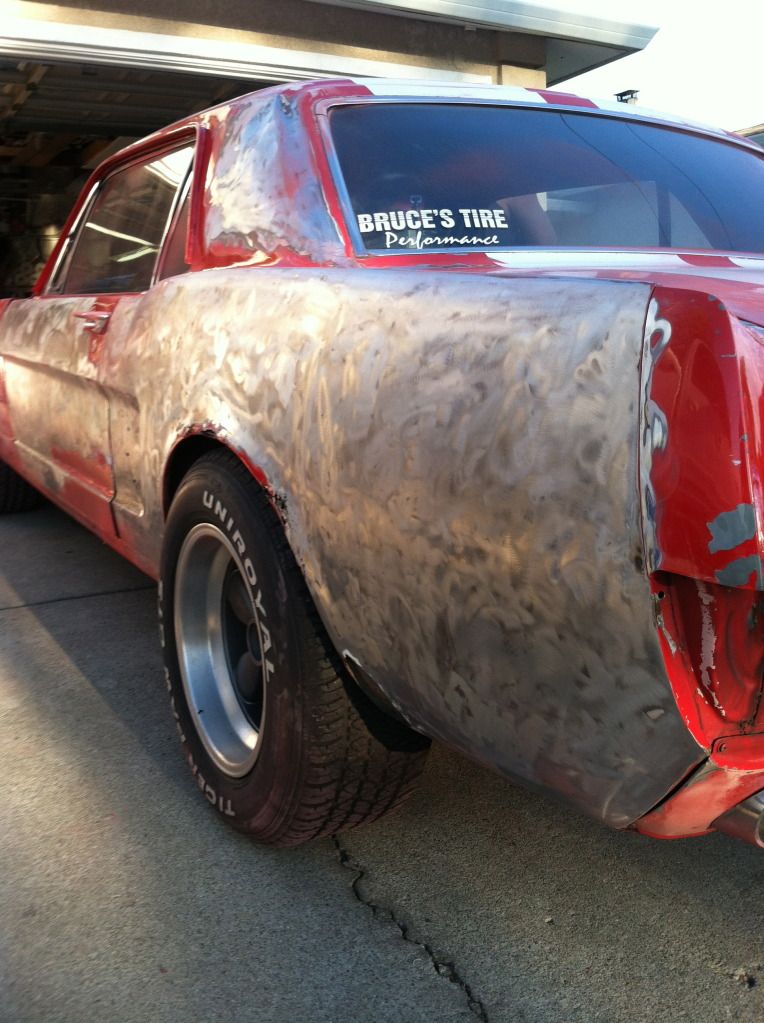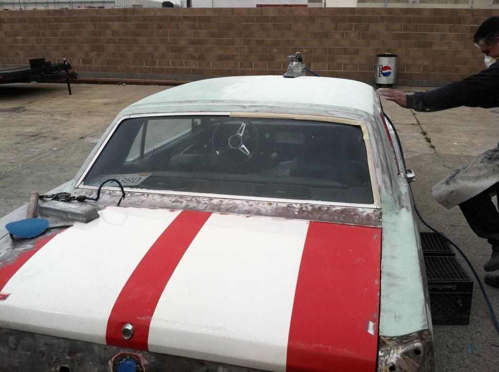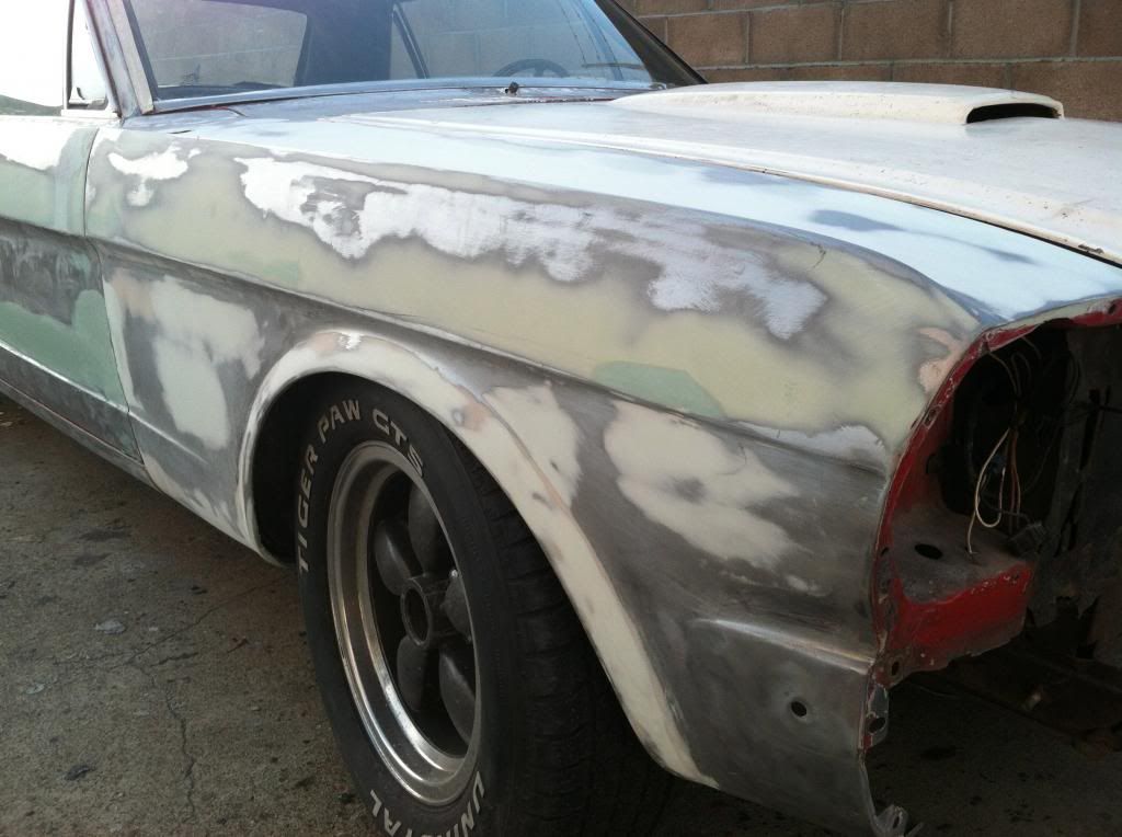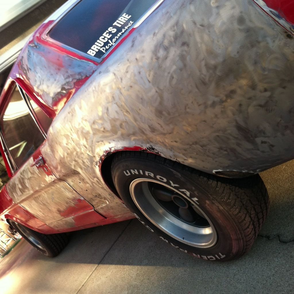 http://i1264.photobucket.com/albums/...ps81fdb3b0.jpg The Car completely stripped. I took the front fenders off to strip them better. http://i1264.photobucket.com/albums/...psca4bafb6.jpg Fenders back on and just about to start all the blocking and sanding on the car. I got a fiberglass gt350 style hood from my grandpas attic. My uncle had it on his car back in the 80's but forgot to latch it one day and it flew up and cracked where the hinges bolt on. I got it and repaired the fiberglass and it worked out good for me. Ill post some pics of the repair soon. http://i1264.photobucket.com/albums/...ps20ed86d6.jpg Random hole I found on the tail panel that was covered with bondo that I discovered when stripping the car. Going to patch soon. http://i1264.photobucket.com/albums/...psb2ddb408.jpg http://i1264.photobucket.com/albums/...ps37187850.jpg http://i1264.photobucket.com/albums/...ps1c93505d.jpg http://i1264.photobucket.com/albums/...psea3bfcf1.jpg Roof was pretty wavy so it took a lot of sanding to get it all straightened out. http://i1264.photobucket.com/albums/...ps0f2dfd6b.jpg http://i1264.photobucket.com/albums/...ps926bf2e5.jpg I rolled the front fenders with a hammer and got it out to a 1" flare. Plan on putting some 1" fiberglass flares on the rear because the quarters are rust damaged. http://i1264.photobucket.com/albums/...ps2d162117.jpg http://i1264.photobucket.com/albums/...ps11febd6d.jpg http://i1264.photobucket.com/albums/...psfa1b2494.jpg http://i1264.photobucket.com/albums/...ps9d0f641d.jpghttp://i1264.photobucket.com/albums/...ps00efb1d5.jpg Some shots around the car. This car is defiantly not a top $$$$ build like it seems like a lot of the cars on here are but Im working with it and Im learning a ton from working on it. |