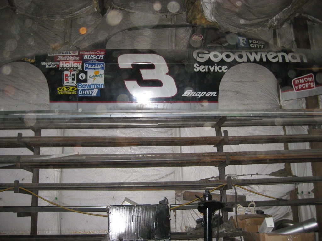 I have had this for year's.It's a body side from a 3/4 race car built by Donny Allison's son's.Raced by Dale Sr.I was planning on taking it down this spring when I hang new ceiling and interiors wall's.Would your son be interested in this.If can find some boxes to ship it.It comes apart. http://i1104.photobucket.com/albums/...ock5/001-1.jpg
