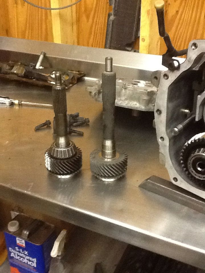 With the chassis out of the way (for now), lets move on to drivetrain. I got a really good deal on a t56 that had been rebuilt. I came across this unit locally to me. The only snag about this tranny, was that it was a 96' unit. Pre-LS version. I knew I was going to put an LS engine in my car, so replacing the necessary items up front in the tranny was in order. And this was fine by me, because I'm the guy who enjoys this type of stuff. A lot! So I ordered a new input shaft, front cover, and bellhousing. Let the conversion begin! This is the longer LS style input shaft on the right, compared to the LT-1 style of yesterday... http://i1278.photobucket.com/albums/...ps76769399.jpg The conversion is pretty simple, as long as you have access to some micrometers, and a way to fixture the tranny up in such a way to measure preload on the input shaft. You'll have to press a bearing race into the rear of the new input shaft, as they don't come pre assembled with the race. You'll have to play with a shim set under the race in the front cover, for the bearing you see pictured on the old input shaft. This is where you set your preload. Done. |