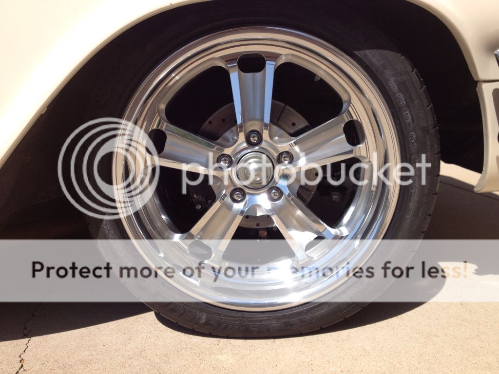 http://i590.photobucket.com/albums/s...ps72436722.jpg http://i590.photobucket.com/albums/s...psfc946bde.jpg Last picture shows my only issue with the wheels, the shallow center caps don't clear brake rotor hub. I have room to shim the wheels out 1/4" , and this move along with turning down the outer diameter of the rotor hub .005. - this should do it. Worse cars scenario I exchange the center caps for the taller versions. Overall the back space tool I used nailed it, the tires are in the wheel wells perfectly. |