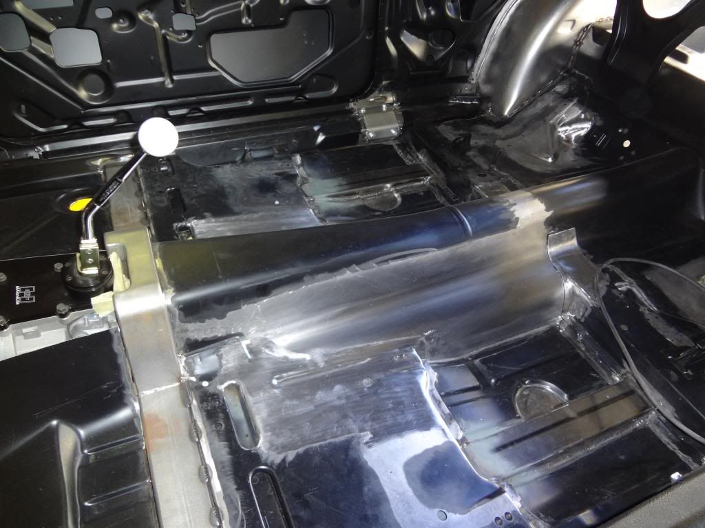 The floor after DSE trans cross-member installed, Art Morrison subframe connectors welded in, floor bubbled to make room for our 3" exhaust to keep everything level with the bottom of the frame.