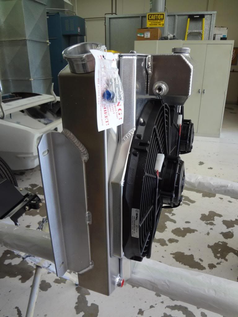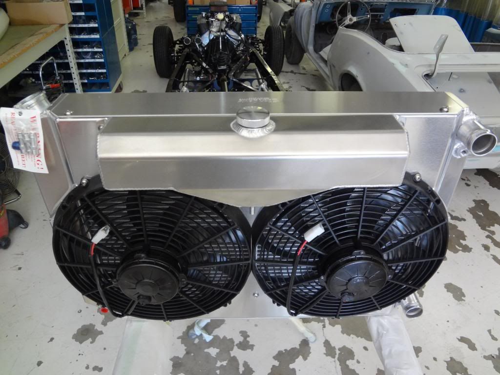 Here is a shot of our Ron Davis built radiator. Packaged neatly with dual 13" Spal fans and integrated coolant recovery tank .