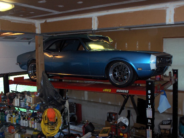 When we purchased our house it was just dumb luck that the garage had a 12' ceiling. Shortly after moving in, I purchased a 4 post lift and simply stored the Camaro on it for many years before starting my PT build. My lift is not anchored and in fact Stinger sells a wheel kit that will actually allow you to move the lift around. I can tell you that there is no way I could have built Dust Off alone without this lift! It was the best investment I have ever made in shop tools. A lift with a 9' ceiling will not be suitable for working under the car unless you can come up will some method of working in a 4' or 5' overhead. My neighbor liked my lift and decided he wanted one in his garage but he only had 9' clearance. He went in and modifed his roof trusses to allow him to raise the car up into the attic space of his garage. As for earthquakes, we had a 7 magnitude quake here is VA a couple of years ago and the car and lift moved about an inch but suffered no damage of any kind. That same quake did crack my basement walls however. For the garage door, I modified the track to raise the door up close to the ceiling and changed the spring and cable system to a torsion spring opener.