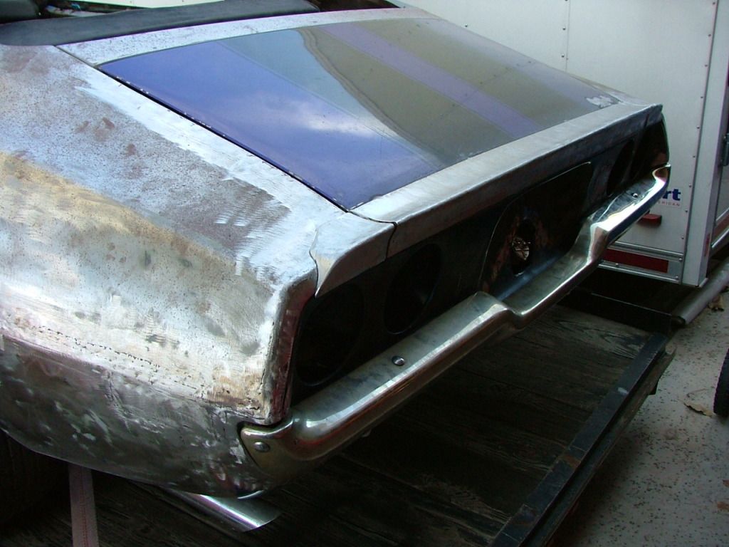 I found this 70 1/2 RS Camaro that a guy had installed a HO 350 chevy engine and a new 400 tranny but it was not painted just in primmer and I decided this would be a good start to a 2nd Gen build that I always wanted to do. Took it down to bare metal and found all kinds of hidden problems. Someone had rearended the car at some time not real bad just pushed the rear roll pan area in about 3" and they just filled it with BONDO!! So the first thing was to find the parts to repair this problem. Here is a picture of the car in bare metal. http://i1072.photobucket.com/albums/...1970Camaro.jpg Found a stock rear section of a wrecked Camaro at a junk yard for $200 and got it back to the shop to install the used section on the car. http://i1072.photobucket.com/albums/...S/Img00331.jpg Here is the rear section where all the bondo was after it was ground out. http://i1072.photobucket.com/albums/...S/Img00161.jpg As you can see it was pretty bad and needed to be replaced. http://i1072.photobucket.com/albums/...S/Img00521.jpg The back was drilled to remove the damaged metal and the new one would be installed. http://i1072.photobucket.com/albums/...S/Img00531.jpg This Camaro will get all kinds of cool little treatments. I will be installing DSE suspension with Baer six piston brakes and Intro Custom wheels wraped by BFG 18" KDW tires. The body mods will be Corvette C6 door handles, a shorter that stock rear spoiler, a half way across the front lower front spoiler, filled side marker lights and tucking in the front and rear bumpers. It will be painted Mercedes silver with a single charcoal stripe and black interior. It will have a Greening Auto custom fiberglass dash with custom mods to the gauge area and the AC ducts. We will use a set of Classic Instrument Gauges and a Kicker stereo system with a RideTech Tiger Cage to keep me safe and be able to use a five point harness for AutoCross. I will be adding pictures as we go along for you guys to see. Thanks for checking it out.:confused59: Goodguy Ed |