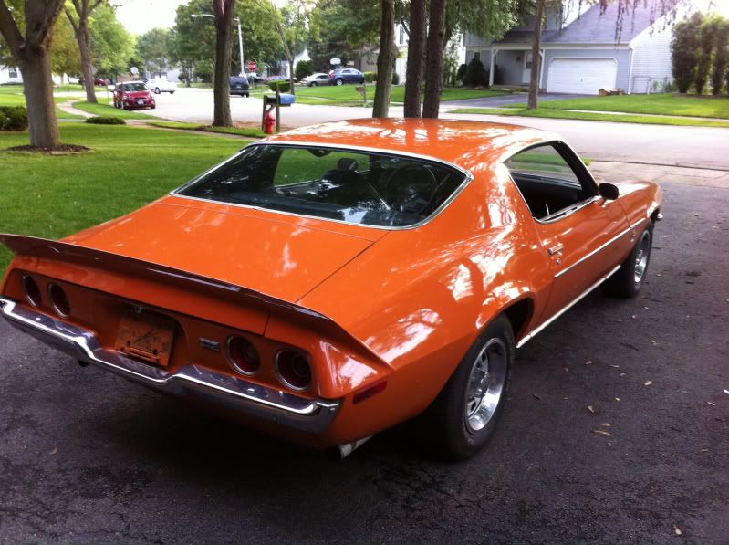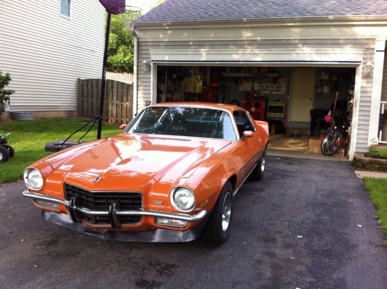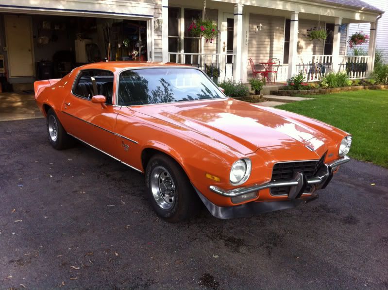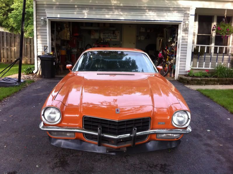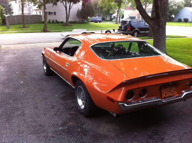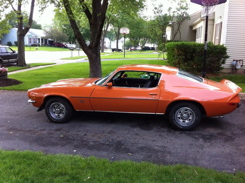 The car is a mostly solid 1973 Camaro, both front fenders lowers and three small spots in the trunk are the only rust on the car. Well that is until I strip it :confused59: For those that don't know and just to :poke: the rest of the 2nd gen owners out there. This car would have been the first 2nd gen built by Mark Steilow sorry but that's not goning to happen now :snapout: This is not a full on build take it apart and hope to finish it some day!! Nope this will be worked in stages, also this is being built on a budget, so not a lot of fancy new parts going in here. Ok so here's the quick plan, some will change as I get into it I'm sure. I will start with the drive train. It has a GM crate 350 with a 350 trans. For now the engine is going to be used, upgraded but still going with a SBC :drowninga: The trans will be changed to a manual, trying to find a T56 6spd but we'll see?? Second round will be a ls2 6spd (already have a deal working on that). Plans for the engine are new gaskets, fresh paint, new cam, headers, carb, and if I can find a deal on a pair of used aluminum heads that would be cool. Rear end will get a freshing, posi, and maybe a gear change. I will paint it and NOT orange maybe silver?? Cowl hood but with MAJOR work done to it as I hate how it looks like a ramp for a water skier :lmao: more on that later. Suspension is still open, ideas? I'm not going to do anything with the front yet as I want to change out the whole sub frame but not sure when that will happen. DSE solid body bushings and DSE frame connectors. Not sure if it will get mini tubed or not as then the bigger wheels and more money come it play. Maybe phase 2 :bitchslap: Rear will stay leafs for now but will change it to Ride Tech I think?? Interior will be mostly stock but freshened up new carpet and seats. Still thinking about seats suggestions?? The biggest part is the wheels, I really want to start there because as you all know shells can make or break how a car looks. I've got a few ideas so we'll see how that goes? Again suggestions?? Also looking at something used (budget budget budget). So here's the starting point with the pictures. http://i79.photobucket.com/albums/j1...ps74243b0c.jpg http://i79.photobucket.com/albums/j1...ps2a6ecb95.jpg http://i79.photobucket.com/albums/j1...ps4b696953.jpg http://i79.photobucket.com/albums/j1...ps3d288fff.jpg http://i79.photobucket.com/albums/j1...ps4928e412.jpg http://i79.photobucket.com/albums/j1...ps4cf67585.jpg http://i79.photobucket.com/albums/j1...pse7bc5901.jpg http://i79.photobucket.com/albums/j1...ps1f8301ea.jpg |
