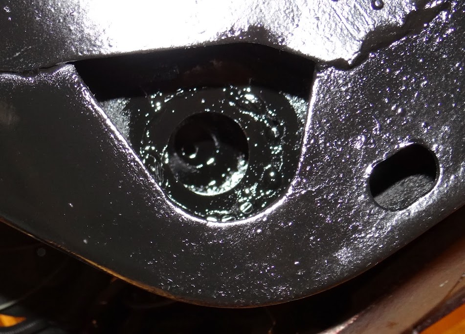 So even though I was feeling less than 100% yesterday, I headed out to the shop about 1 pm and settled in to repair my #2R body bushing frame hole. I was lucky that there was still enough of the existing hole left to let me use the bushing to mark where the repair washer was going to go.