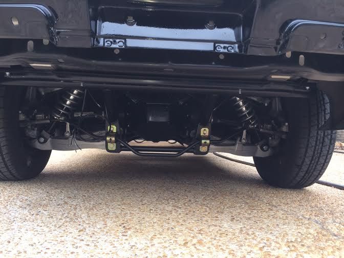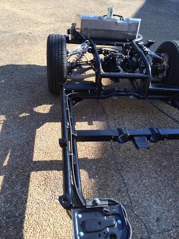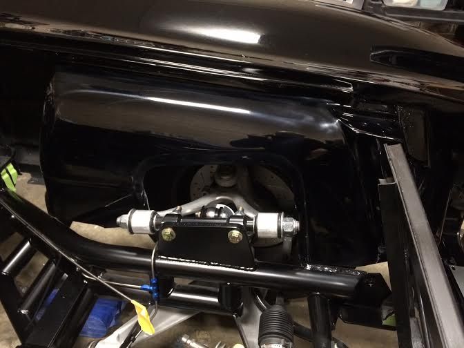 We lowered the body back on the chassis today. Had a good bit of interference on the fender skirts at the rear of the control arms and the lower portion at the bend in the frame rails. A little minor trimming with a saber saw and everything cleared.
