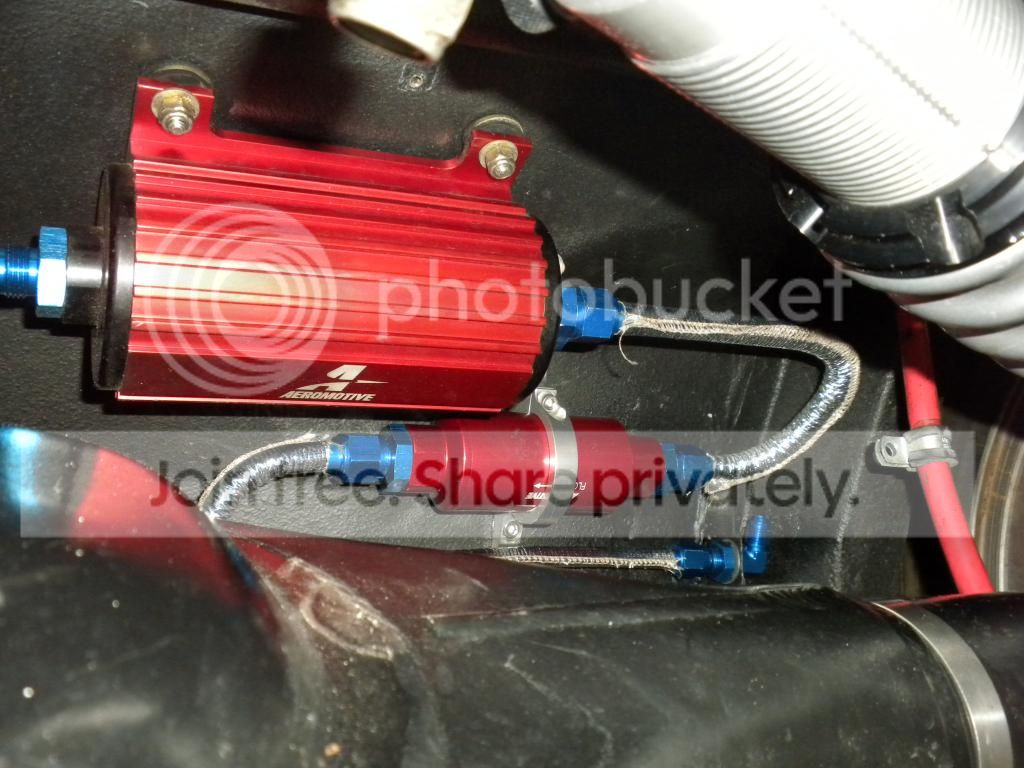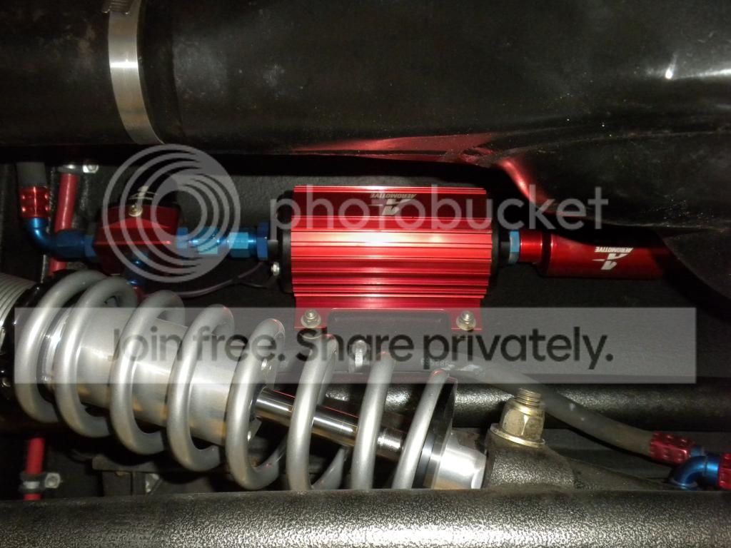 The 70 Chevelle listed in the sig below as a feature vehicle was plumbed with a Ricks tank with the intank A1000 drop in unit with the built in pre-filter. It was powered through an Aeromotive Duty cycle controlller. Post filter right outside the tank. Regulator hidden up on the firewall behind the engine It put down 820rwhp with boost. -8 supply and return line.