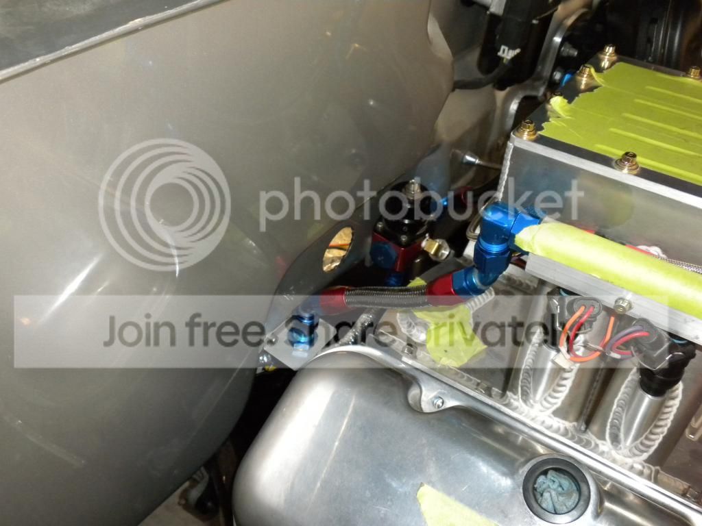 With the the fuel pressure regulator at the rear of the vehicle you will develop a pulsing in the fuel pressure that will affect drivability. Think of throwing a pebble in a pond, the ripples get bigger as they travel. Unique Performance was very fond of putting their fuel pressure regulators in the rear of the vehicles and on the EFI vehicles you can watch the rail mounted gauge jump 20-30 psi while idling... try fighting that while tuning. On the carbureted blown FE's with the regulator mounted in the back we were fighting lean tip ins on hard accel.... we were getting just enough of a delay with the vacuum signal running from the engine to the rear of the vehicle and the boosted fuel pressure going from the rear of the vehicle up to the carb that we were seeing a delay in fuel pressure. Regulator moved up to the engine bay... problem solved. When I replumb the fuel systems on these vehicles I thermo-sleeve all of the lines because they do run up the tranny tunnel where they get alot of exhaust heat. On I do recommend the use of their duty cycle controller to slow down the A1000 fuel pump operation for regular driving. I always plumb my rails so that the regulator is after the engine.. In my head I would rather have full fuel flow available to the injectors rather than "regulated" fuel (I know it's all regulated ) to lessen any changes of starvation. I also plumb them parallel instead of series where the last injector would have a higher chance of starving. http://i696.photobucket.com/albums/v...psd7f99045.jpg |