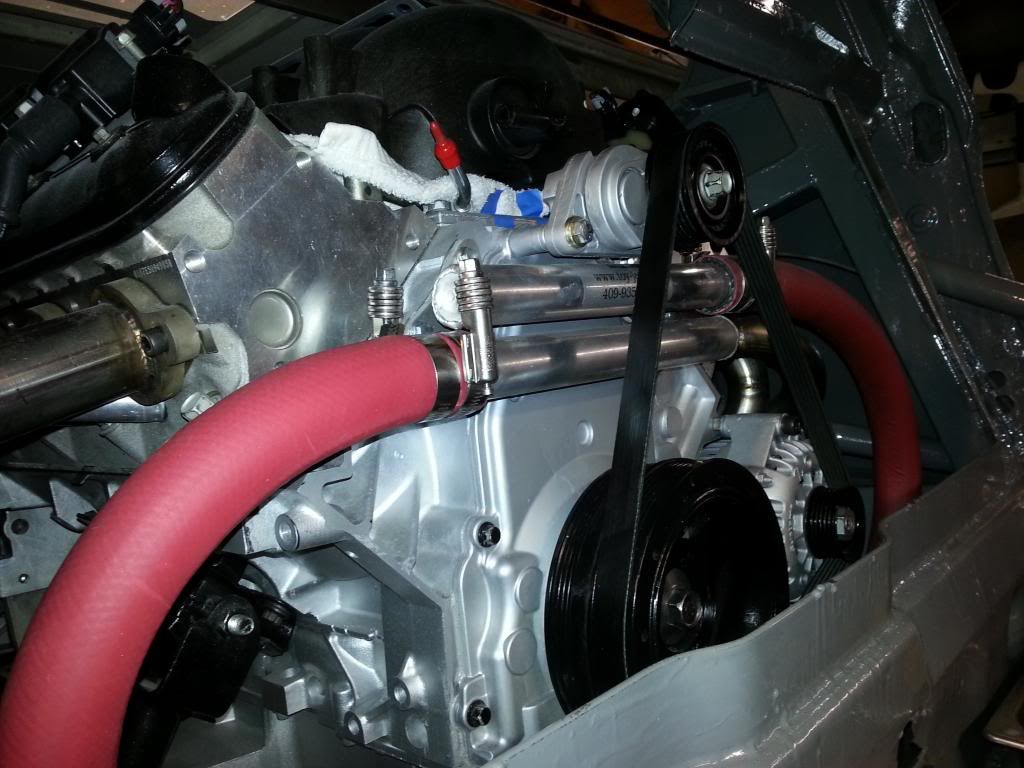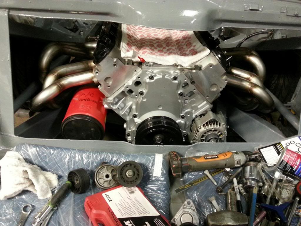 compressor. I've seen a number of compressors that will fit the space represented by the coffee (red) plastic container. I am also looking for a power steering pump to put in the center above the crank shaft pulley to act as a pump and an adjuster. I was able to install the alternator quite easily, it didn't fit but was close. I had to cut a small amount off the case of the unit and refit one of the 3 housing bolts. Having done that it fits tight & keeping it low as I can. Trying to keep everything mounted as low as I can on this build as overall CG is paramount to me. http://i60.photobucket.com/albums/h3...15_resized.jpg http://i60.photobucket.com/albums/h3...32_resized.jpg http://i60.photobucket.com/albums/h3...50_resized.jpg |