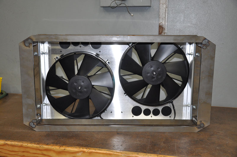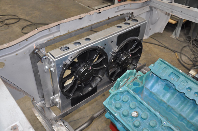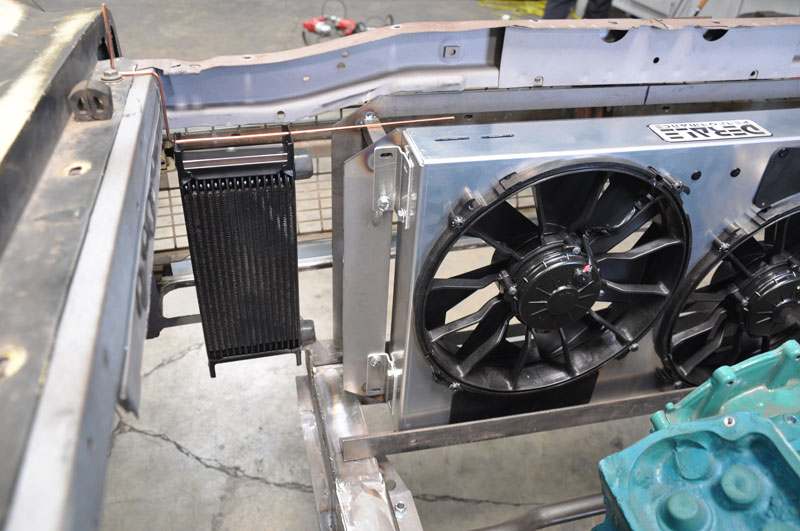 We built a dual aluminum fan shroud and custom core support. We attached one of our High Performance oil coolers next to it to get maximum natural airflow to keep it cool.
