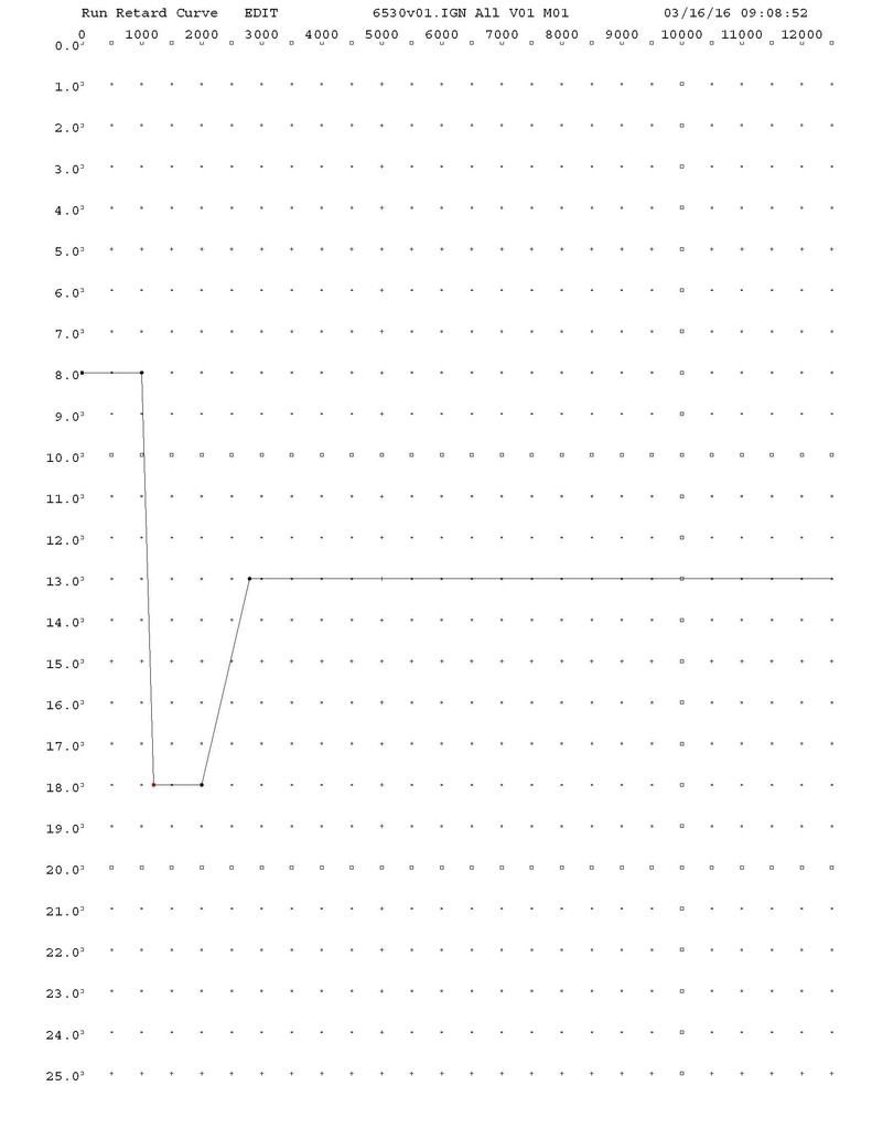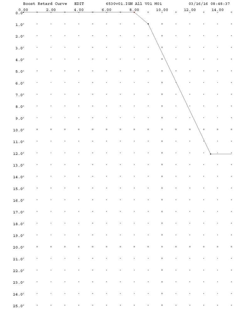 Distributor is locked out at 45* advance, Run Retard is set as below, Idle timing 0-600 RPM -8* (37* actual) 1000-2000 RPM -18* (27* actual) 2800+ RPM -13* (32* actual) http://img.photobucket.com/albums/v3...pssm0zdqen.jpg Boost Retard is set as below Full vacuum 17"-12.4" at idle or cruise -0* (37* idle, 27* 1000-2000 RPM) 9 psi (12.2" vacuum) -1* (26* actual 1000-2000 RPM) 10 psi (10.1" vacuum) -3.2* (23.8* actual 1000-2000 RPM) 11 psi (8.1" vacuum) -5.7* (21.3* actual 1000-2000 RPM) 12 psi (6.1" vacuum) -8.4* (18.6* actual 1000-2000 RPM) (23.6* 2800+ RPM) 13 psi (4" vacuum) -10.9* (16.1* actual 1000-2000 RPM) (21.1* 2800+ RPM) 13.5 psi (3" vacuum, WOT) -12* (15* actual 1000-2000 RPM) (20* 2800+ RPM) http://img.photobucket.com/albums/v3...psenblntrp.jpg On the idle side, the only thing I can think of is I might need to adjust the Run retard between 800 and 1000 so it remains at a steady state there as my idle fluctuates in that range and a moving timing mark will probably make it fluctuate more. Maybe something more like this. Is that too sharp of a transition between 1000 and 1200 RPM? http://img.photobucket.com/albums/v3...psmaeazv0b.jpg On the WOT side, it appears that I need to make the Run Retard more like this so I can see full 32* timing 2800+ RPM http://img.photobucket.com/albums/v3...psx9u3pa12.jpg 12 psi (6.1" vacuum) -8.4* (18.6* actual 1000-2000 RPM) (33.6* 2800+ RPM) 13 psi (4" vacuum) -10.9* (16.1* actual 1000-2000 RPM) (31.1* 2800+ RPM) 13.5 psi (3" vacuum, WOT) -12* (15* actual 1000-2000 RPM) (30* 2800+ RPM) I'm not sure how to get those last three lines closer to the desired 32* timing at WOT past 2800 RPM? The variable is vacuum inches, not RPM...so it's almost back to my other method of stopping the Boost Retard right before WOT. |