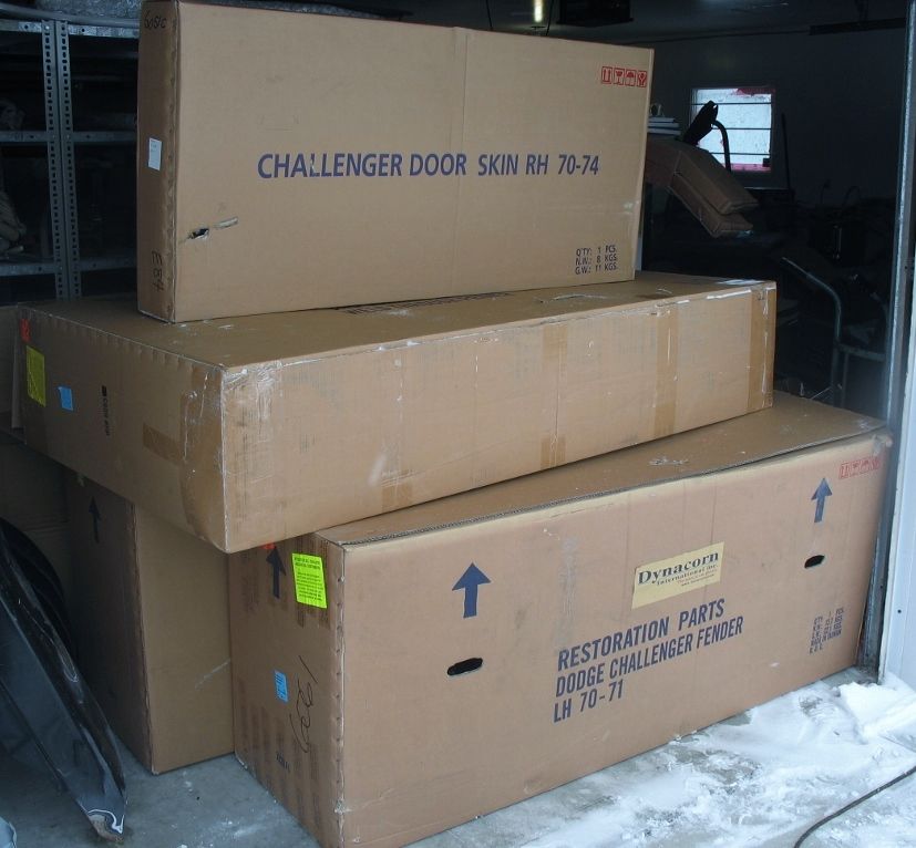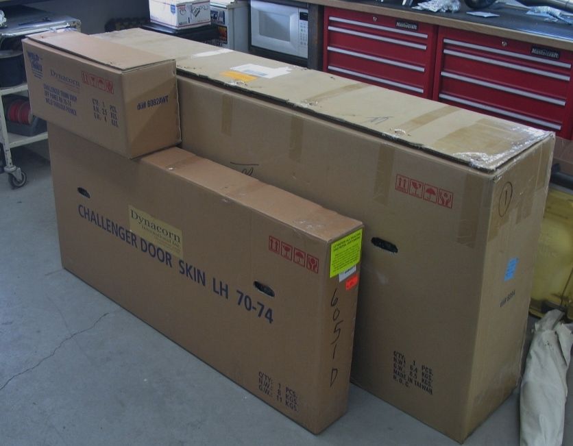 So, we got a nice a surprise yesterday in the form of four large boxes for the Challenger. Front fenders, door skins and hinges.