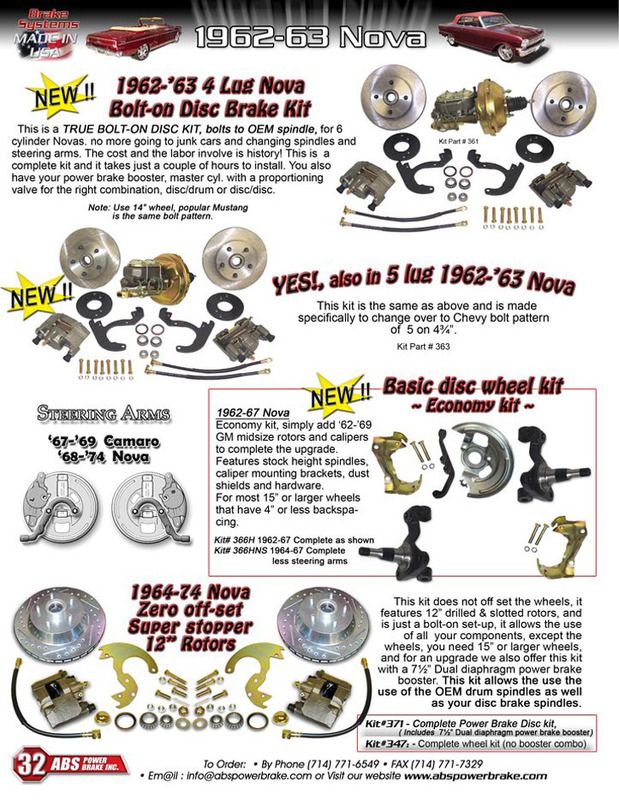 I chose this brake kit so my 1963 Nova SS can stop a lil better while i figure out my final suspension/motor/wheels/tires/brake setup. It was supped to be a direct bolt on kit. After installation it appears that the caliper bolts made contact with the inner rotor. I called ABS to find out that they made the sleeve that sits in the caliper mounting hole a bit too long. FLAW!!! I measure mine and they were the right length. The customer service rep. says that there should have been a spacer included in my kit and he will send a set out. Well now i have a huge grove on both front rotors from literally driving up and down the street once. I spoke with Ed who says he's not the owner but he is the "end all,be all" at the company. He informed me that this is installer error and will not replace my rotors. I believe he will not replace my rotors because he does not have any rotors. I was told that they change designs on their products often and do not stock replacement parts after a new design is released. I also asked what i should do if i needed new rotors from them in the future and i was told "you would need to buy a new kit" So after 15 min on the phone going back and forth the guy hangs up on me! I call back and tell him to send the spacers. I also tell him i will be contacting the person above him to file a complaint. I know there are more reputable places to find brakes like Wilwood, Baer and Kore3. Well i guess i learned my lesson the hard way! This thread isn't to bash, but to bring this type of situation to light for other builders and most importantly save everyone time and money! THE END |