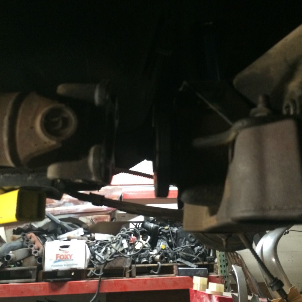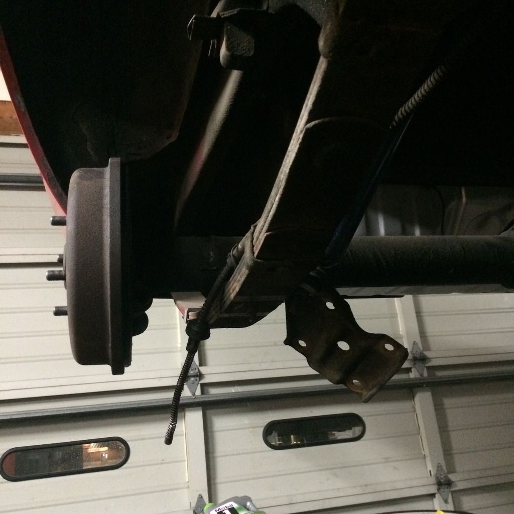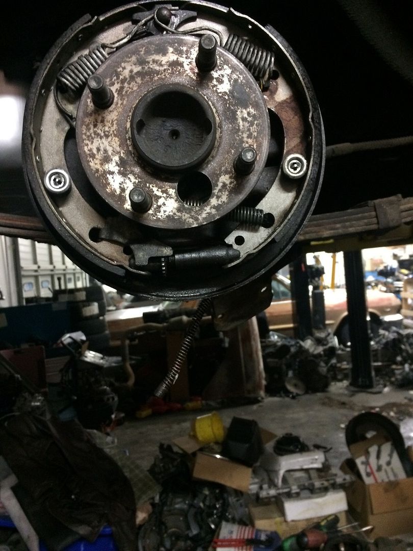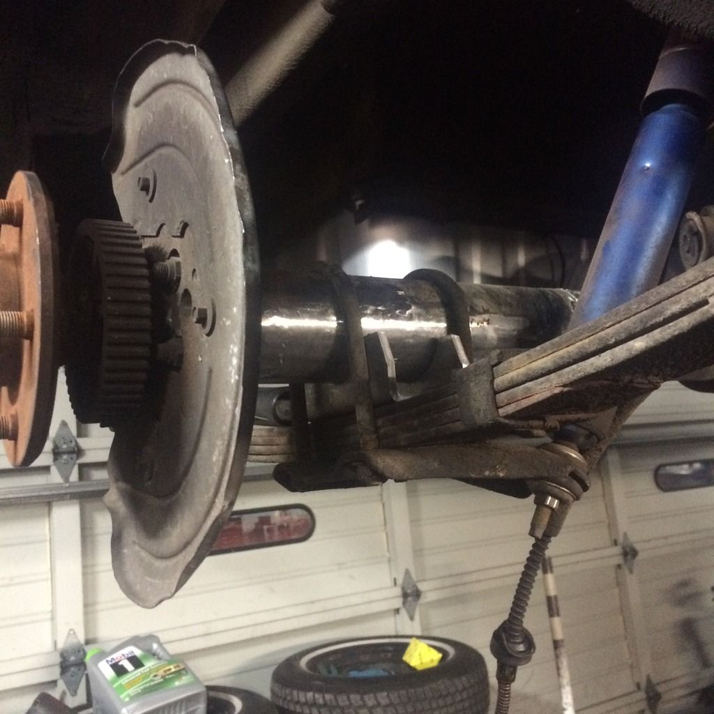 The original rear end needed to come out to make room for a V8 axle so I took off the drums and disconnected the parking brake cables. I also undid the u-bolts that were holding it onto the springs.
