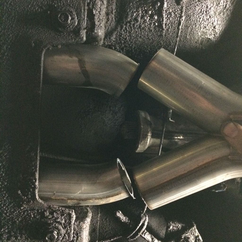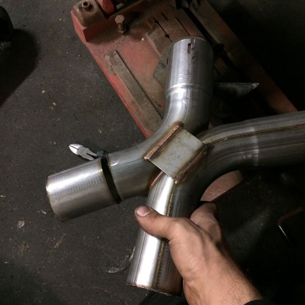 This is where I made a quick slice in the x-pipe. This was necessary because the tunnel that the exhaust and driveshaft run through wasn't wide enough to fit the "bolt-in" exhaust.