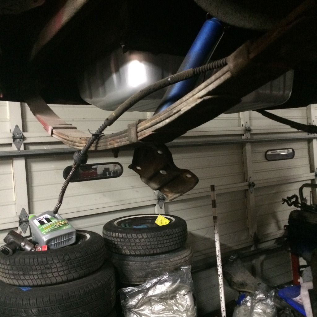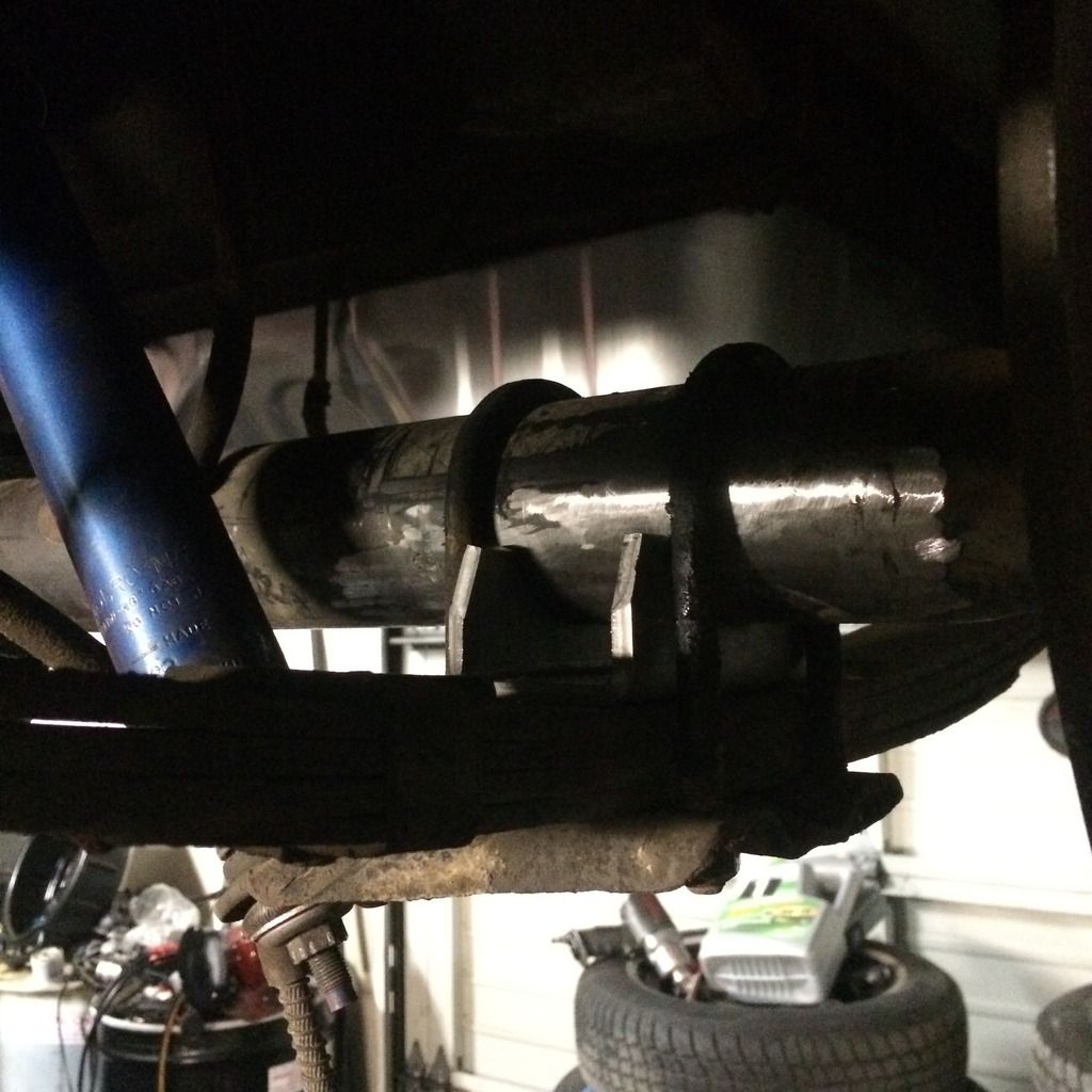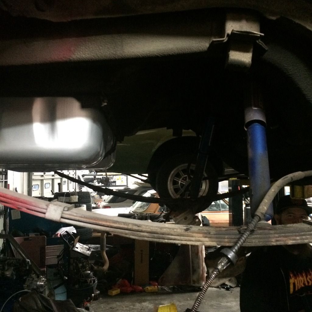 http://i42.photobucket.com/albums/e3...DACEECC72F.jpg http://i42.photobucket.com/albums/e3...2C996B4924.jpg So I'm left with the leafs and shocks sitting back here. You can see the '68 'Stang in the next bay over through the wheel well openings. http://i42.photobucket.com/albums/e3...6DD77E8564.jpg http://i42.photobucket.com/albums/e3...282F67158B.jpg After I set the weld in plates on the springs, I hoisted the shaved '94 rear end up there. http://i42.photobucket.com/albums/e3...9EC6C16254.jpg http://i42.photobucket.com/albums/e3...C59ECE4FBD.jpg And, lastly.. the driveshaft is going to need to be lengthened just a little bit. And after I raise the transmission mount a tiny bit, the driveshaft won't scrape the tunnel bottom at full droop. http://i42.photobucket.com/albums/e3...BAE5087FF2.jpg http://i42.photobucket.com/albums/e3...5EADDFAE06.jpg |