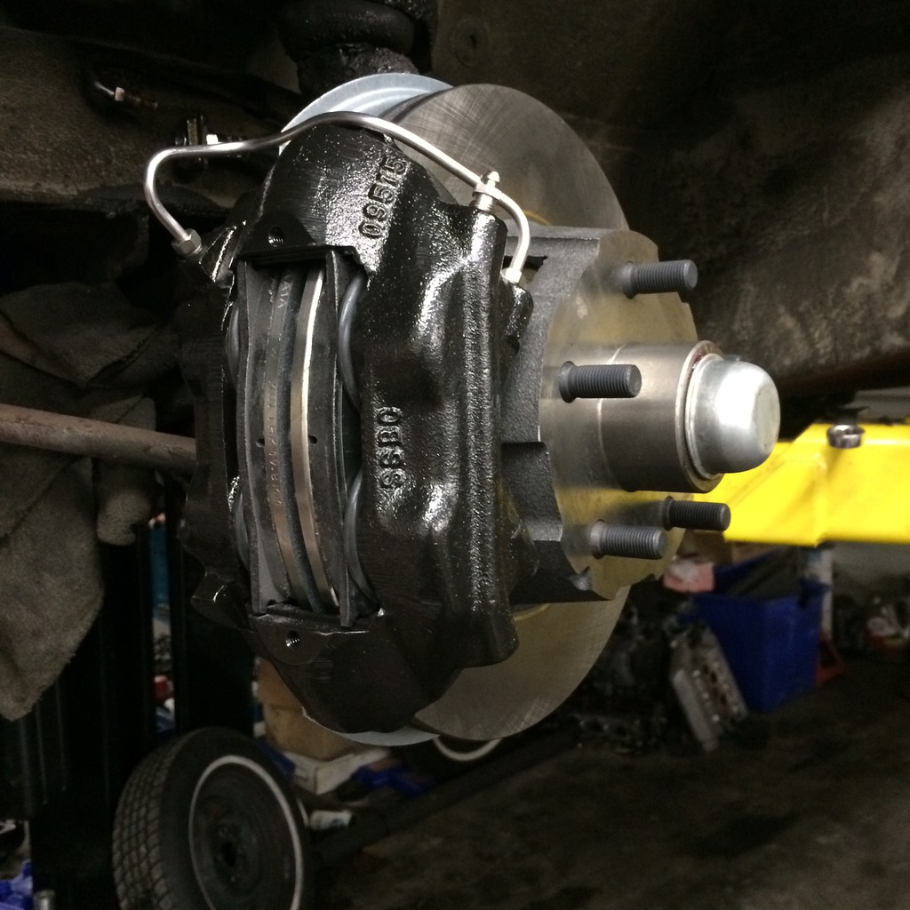 These Mustangs have weird (to me) caliper attachments. Instead of a banjo bolt, they thread directly into the caliper. One washer. Attachment 56714 Attachment 56715 Toss them on there with a little bit of blue Loctite, slip the pads in and install the pad retainers. Attachment 56716 Pretty good, methinks. Attachment 56713 |