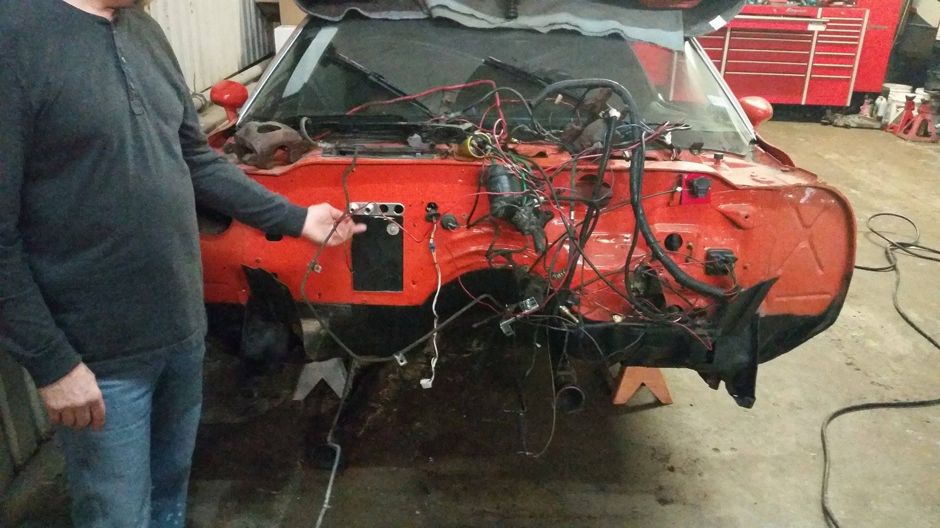 Painless wiring harness will eliminate and rewire all those goofy wires Needed power steering pump Needed new air compressor all vintage stuff other than that was good Ididit steering column MSD atomic fuel system New gas tank and set up for new fuel system New battery New radiator New inner fenders New billet specialties hood hinges with the gas shock New Hood latch Car has a 4l80 e so going get a converter for it. Bought SW rims even though was not ready but will be eventually for wheels some time. HAHA Where we stand now. |