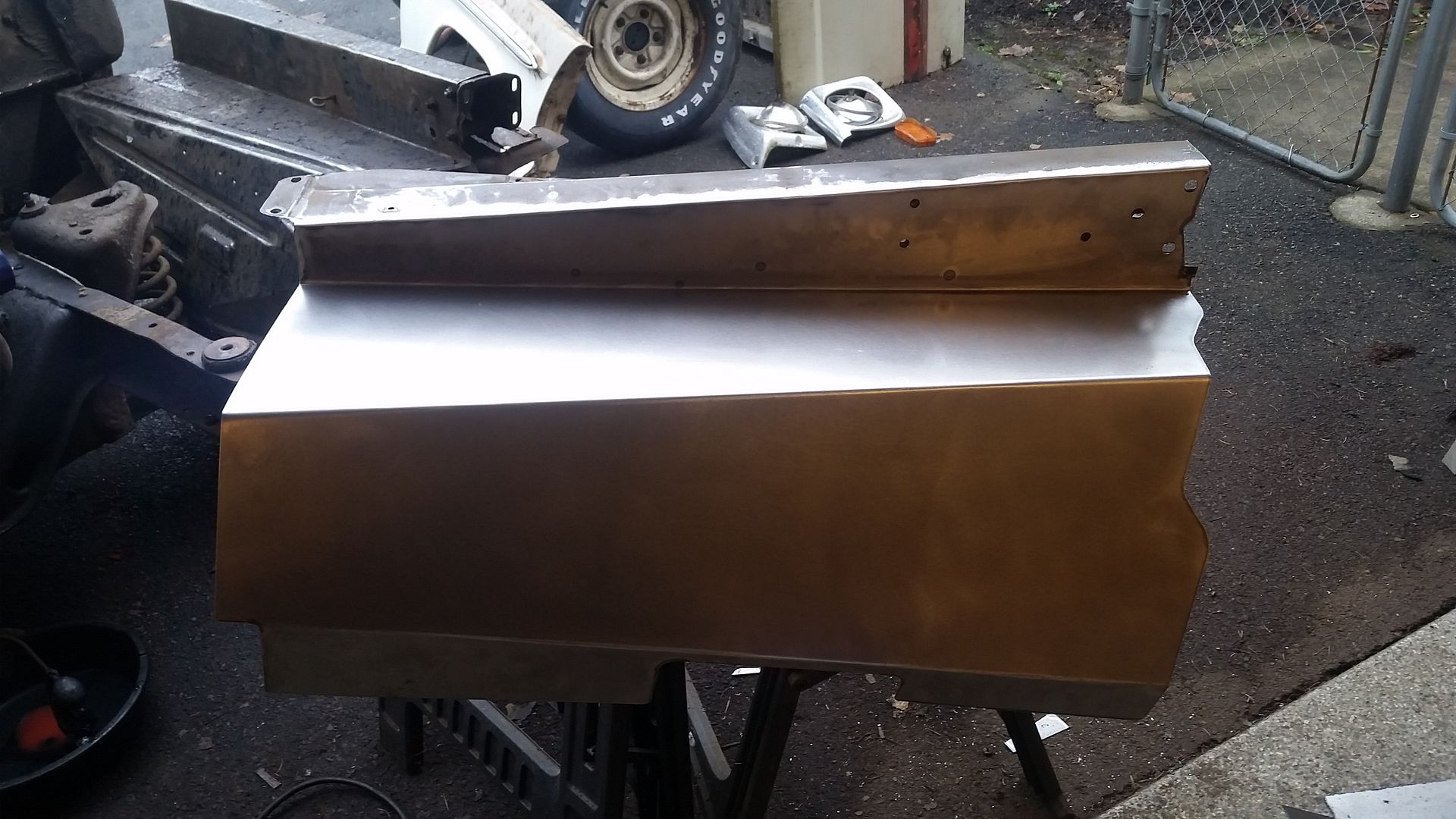 Been stumbling along the last several weeks with some less than exciting work but its all gotta get done to go together. Driver side fender was trashed on the truck when I got it along with the core support and a few other bits. So I picked up a parts truck for a few bits and pieces. The fender had trim on it and a couple pretty good dents so it needed a bit of work. Did a little bit of body work on the fender and welded up all the holes on it, no filler. Primered with the same factory stuff, grey and then red oxide, then the pebble beige on the truck from the factory. http://i1133.photobucket.com/albums/...psseym8btt.jpg Then some rattle can in a little more yellow to match the rest of the truck. http://i1133.photobucket.com/albums/...ps834hwmq8.jpg Keep in mind, trying to match the rest of the truck. This is the red stripe going on. http://i1133.photobucket.com/albums/...ps6wcfpzwr.jpg Now with the brown. http://i1133.photobucket.com/albums/...psyltzn8h1.jpg Here is what a nice and pretty fender with lots of paint would look like =) http://i1133.photobucket.com/albums/...psjis50jfx.jpg Hit it with some paper and started to get it to match the rest of the truck. http://i1133.photobucket.com/albums/...pslhikfhxb.jpg I have not done any color sanding on the door yet but its damn close and will fit in just fine on this turd. http://i1133.photobucket.com/albums/...psbunmmmxs.jpg So on with some other stuff. I needed a little more clearance for the upper link in the bed floor and I dont have an english wheel or other fancy tools so I got to work with some plate and u bends. http://i1133.photobucket.com/albums/...psnrnqxml5.jpg http://i1133.photobucket.com/albums/...psd0qb5zt2.jpg Giant hole cut in the bed floor and some welding later it was all good. http://i1133.photobucket.com/albums/...ps6sqc3o4x.jpg |