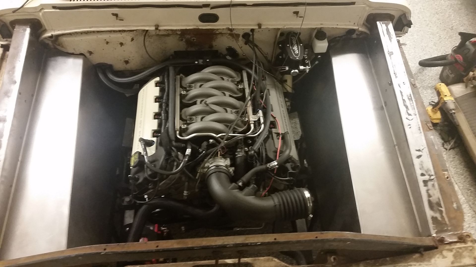 Damn good weekend, if I can say so. Picked up the filter and it is perfect, just what I wanted. It is nice and clean and fits well in the engine bay, away from the radiator and near the front corner away from as much heat as it could be and protected from any water as well. Got to building a mount for the air filter, might have gone a bit overboard for just a filter bracket but its cool. http://i1133.photobucket.com/albums/...psat6e8lyb.jpg http://i1133.photobucket.com/albums/...psdztmqzne.jpg http://i1133.photobucket.com/albums/...pstzp2lxau.jpg I think the intake turned out well for modifying the stock crap. Once I can get the truck on the road and find someone that can tune it, I will likely do a JLT intake on it but this should work for now. http://i1133.photobucket.com/albums/...psgnggiqbb.jpg http://i1133.photobucket.com/albums/...ps82r9jutp.jpg And that is the end of photo taking for the day. I did a bit of other stuff though. I was having issues with the clutch master cylinder, I could not get it to bleed very well so I tackled that first. Got the wife to help me a little bit more. I tapped on the hose and got it as flat as I could and uphill the entire length of the line. See there is no provisions for bleeding this thing, its just through slowly pressing the pedal and releasing to get all the air out. We got that sorted out and the air bled out of it but I could still not get the clutch to release, I felt like it was just not pushing the pedal far enough or not getting all the travel out of the master. So i started measuring and looking at the pedal. Turns out my hunch was right. Where I built the double shear on the pedal apparently It hits the heim joint and I could only use the top hole. So out with the air saw, the cutoff wheel, some files and a die grinder and an hour or so later I was able to get the full travel on the master cylinder and got it pretty well adjusted. One more try, the wife pushed down the pedal in gear and hot damn I could spin the driveline!!!! This was a pretty big relief that the stuff I had was indeed going to work and play well together. So, I moved onto the gauges to see if I could get all that crap to work together. Read the manual and went through all of their setup and got everything to work with the exception of the oil pressure. Pretty sure that the coyote does not use or is not setup to use the input from the oil pressure sender. I swapped in the sender from the Dakota Digital into the block and hot damn we have a full set of working guages on the truck. I also cleaned up all the wiring under the engine cover and got the insulation on the fuel rails and got the factory heater hose guides on. Most of the work on the engine is complete. I need to build some exhaust and get the overflow for the radiator. Garage is a mess, time for a few hours of clean up!!!! Sean |