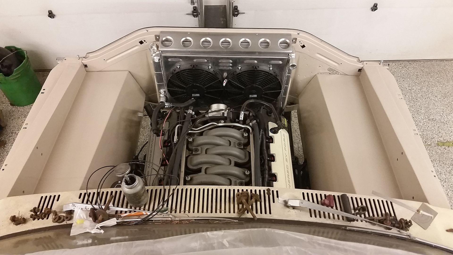 Oh, here is the mockup...looks good to me http://i1133.photobucket.com/albums/...psdf5chauc.jpg Getting the radiator mounted up, its a generic one from Northern but fits the opening about perfect. Need to come up with an upper mount for it as well. http://i1133.photobucket.com/albums/...ps1kevsizo.jpg In mockup http://i1133.photobucket.com/albums/...psiev66yzs.jpg Final fab on upper mount. Turned out good....I am no sheetmetal fabricator or welder so for this to turn out like this I was pretty happy. http://i1133.photobucket.com/albums/...psok9dhpix.jpg Any Dexter Fans out there???? http://i1133.photobucket.com/albums/...psecvkvmnx.jpg http://i1133.photobucket.com/albums/...ps592ohjpr.jpg http://i1133.photobucket.com/albums/...psq34fawiq.jpg Its a matte Pebble Beige, the finish is exactly what I was looking for. http://i1133.photobucket.com/albums/...ps5jrwul5c.jpg Starting back with some assembly on the frontend. http://i1133.photobucket.com/albums/...pswbhctqux.jpg Power Steering reservoir and lines installed. http://i1133.photobucket.com/albums/...psav9vlof6.jpg Spent a bunch of time on the sheet metal this weekend. Color sanded the passenger fender and got it fairly flat and hit it with the buffer. http://i1133.photobucket.com/albums/...psyhykyqjj.jpg Sean |