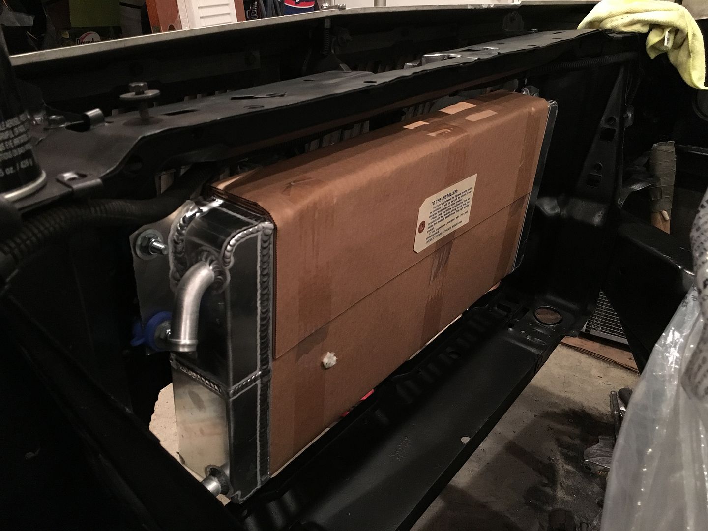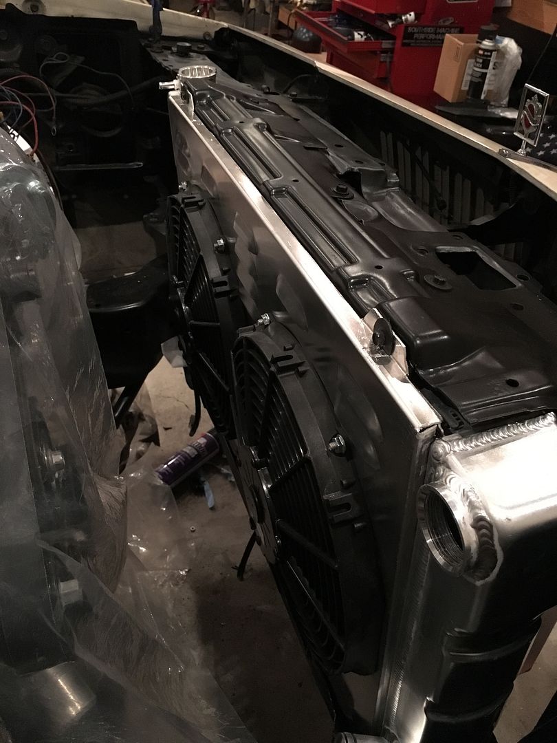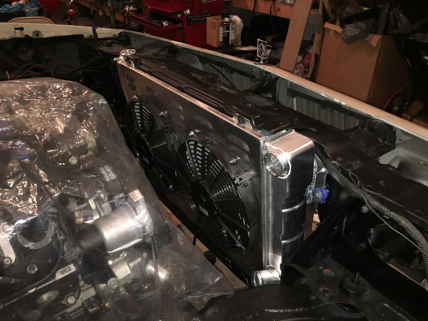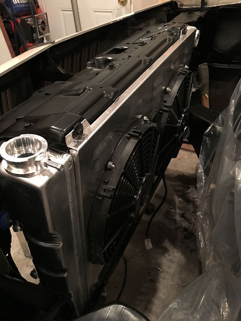 I have a few minor tweaks to do with the rad but it and the fans are mounted. Surprisingly longer than I expected to take with this darn thing....stuff just didn't fit to each other as well (dimensionally by description be damned...haha). Anyhow its in as of this evening and will be ordering up a LOT of sensors this week so I can get the trans wiring and the rest of the main harness wiring done. I also want to get the headers on and start installing the exhaust!!!! Once all that "fun" is done I'll install the front suspense with the Z06 brakes (really looking forward to that!!!