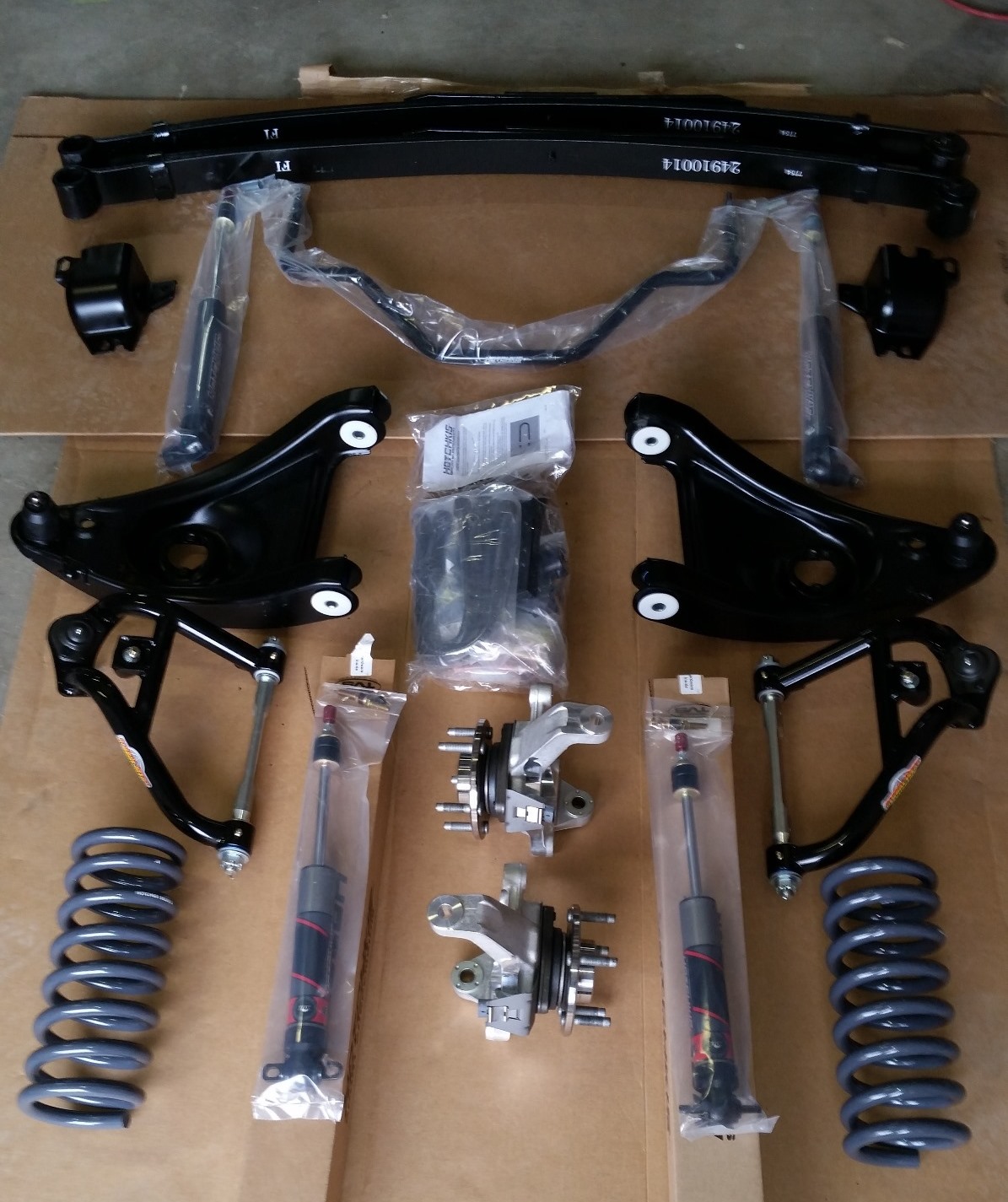 Attachment 61466 I laid out my suspension parts so I didn't forget about anything. Attachment 61470 I like the way the front suspension came together! I still need to install the shocks and front sway bar. Attachment 61469Attachment 61464 Then I started working on the new rear. I discovered even after drilling out the holes on all the brackets to 5/8", the u bolts didn't quite line up. The holes on the brackets would line up for a 3" inside diameter, but the u bolts I got in the Hotchkis kit were a little bit bigger diameter. So I spent quite a while with the die grinder until I could get them through all the holes. I think it turned out pretty nice. Attachment 61468 Then the heavy lifting came when I started installing the new leaf springs. I'm glad that part is over, but I really like the way it looks so far! Attachment 61467Attachment 61465 Next weekend I'll install the new bushings in the rear frame rail and start bolting the rear in. |